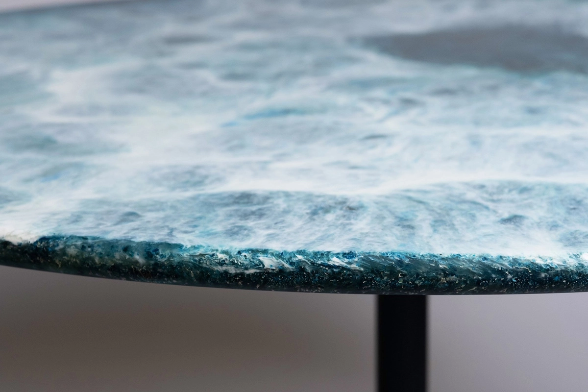 Liv Tundra retains the signature steel base with its fluid curves inspired by water movement, but tells a compelling story of transformation. The tabletop, reminiscent of a seaglass shoreline, is crafted from reclaimed food packaging and yogurt containers—a testament that extraordinary beauty can emerge from the most unexpected sources.