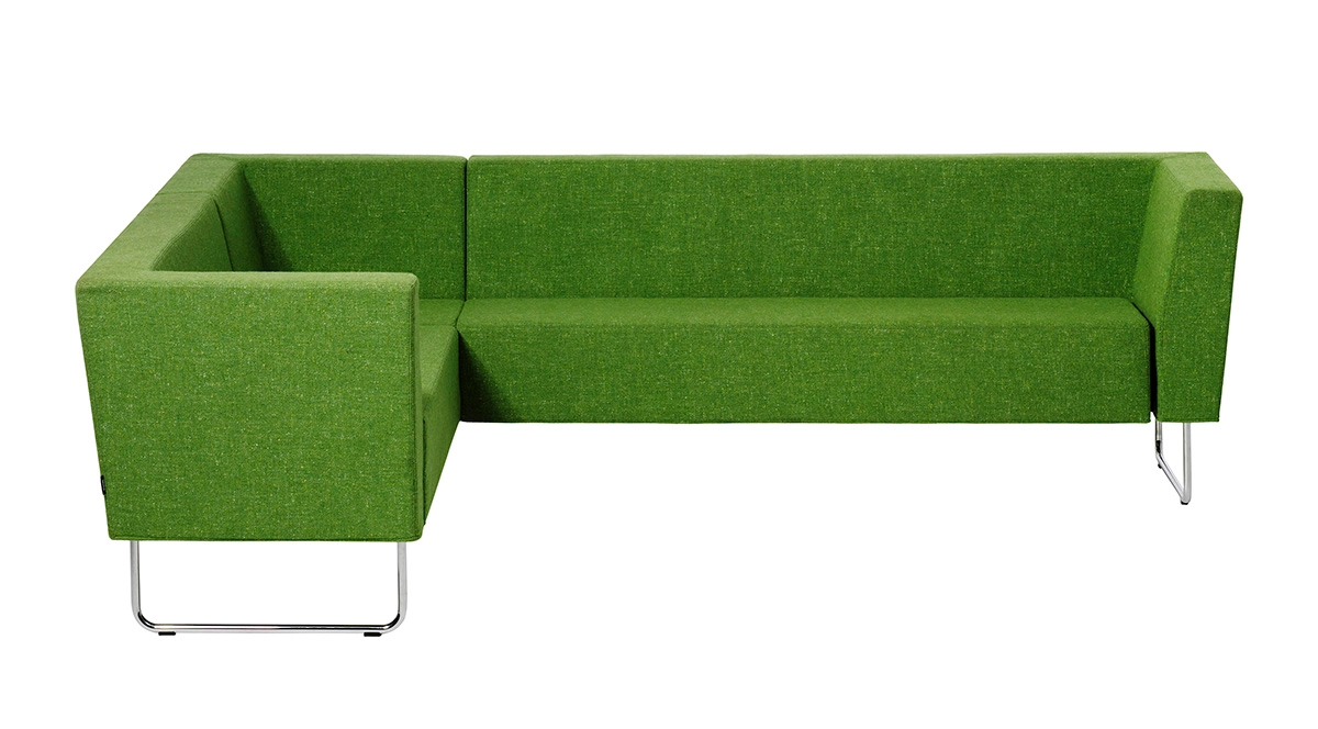 easy chair, sofas, benches and modular sofa system with a seat height adapted for café-, dinner- or conference tables. Steel sled base in chrome finish, or with legs in either oak or birch.