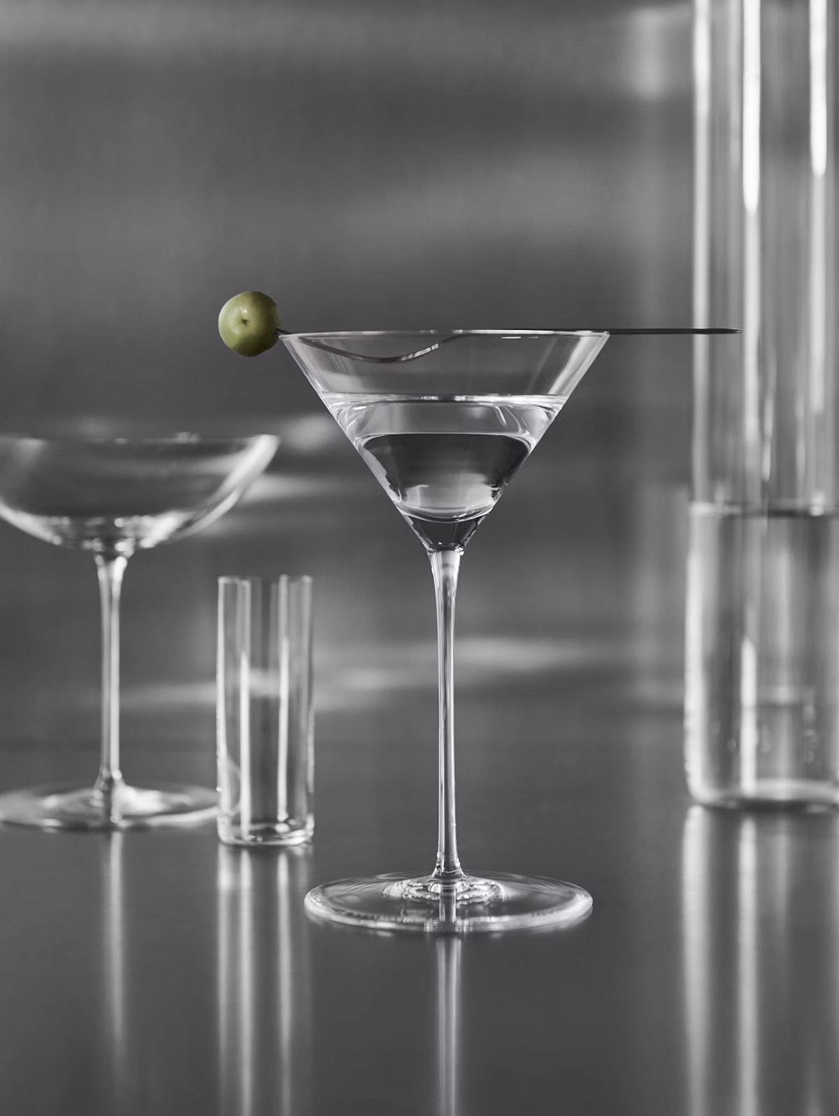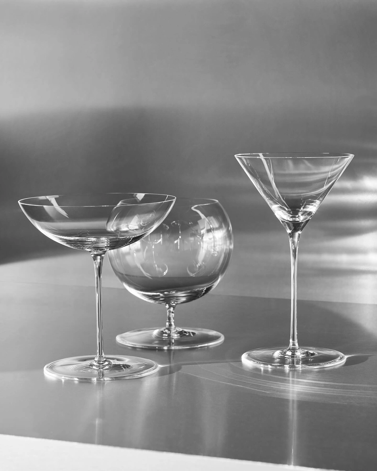 Specialty glasses for champagne (25cl), martini (20cl), and cocktails (26cl)