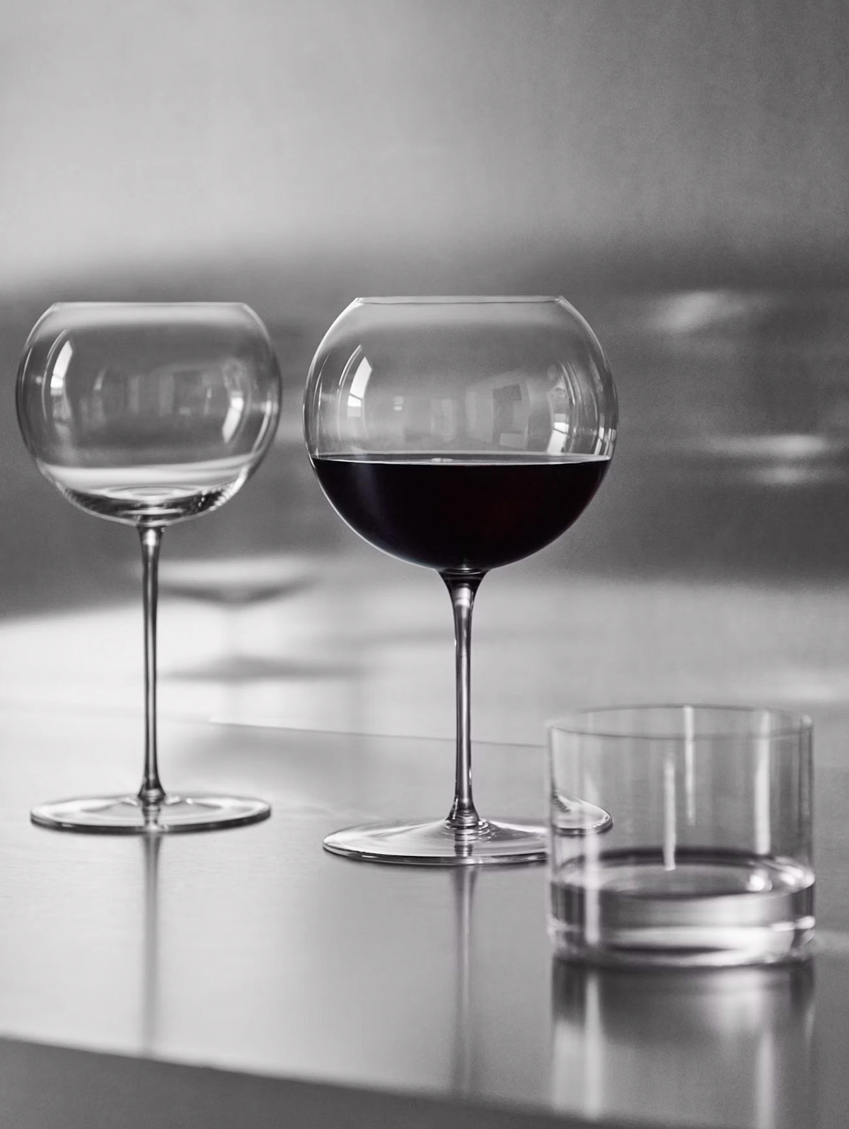 Each piece in the 12-part collection is a study in pure form, where spheres, cylinders, and cones merge to create an unmistakable silhouette. The series spans from generous red wine glasses (72cl) to delicate snaps glasses (6cl), with every piece mouth-blown in Orrefors’ signature thin, light crystal.