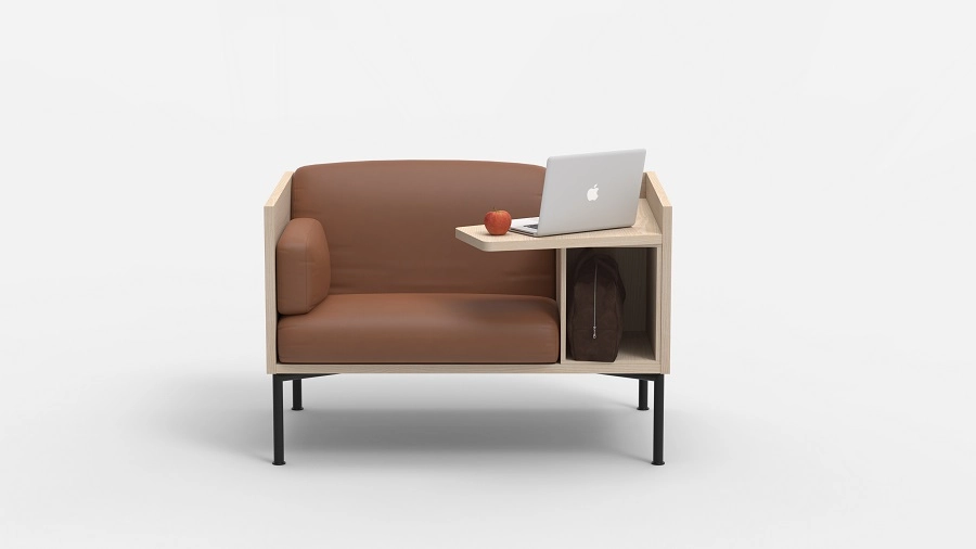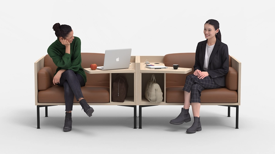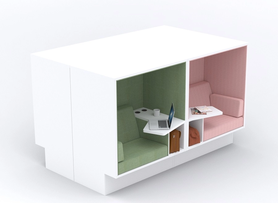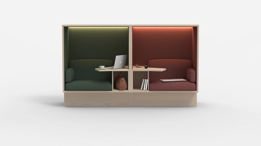 Our lower Mute Focus low is based on the same frame as Mute Focus but is made for open environments, e.g. project meetings or in a lounge environment. Mute Focus Low has all the accessories like Mute Focus, i.e. workspace, possibility to set the bag and electricity for charging.
