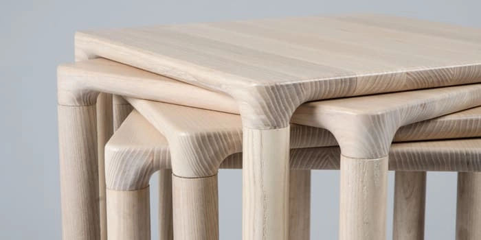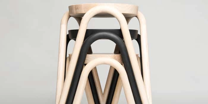 Kristine Five Melvaer exhibits the Vava stacking stool prototype, alongside the colourful, oversize doormats she created for new Norwegian brand Heymat and blankets from Røros Tweed. kristinefivemelvaer.com