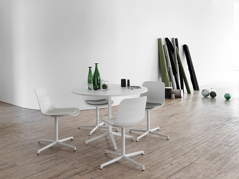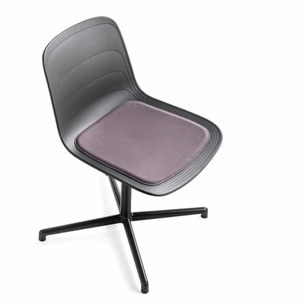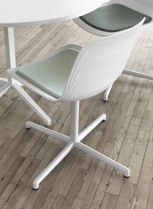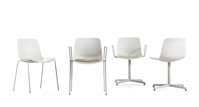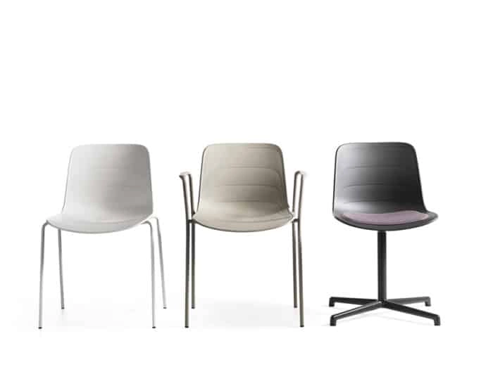 The shell is available in three different, easy to place, colours, white, beige and graphite. Grade is offered as a chair and armchair and also with a swivel base. The frame matches the colour of the seat shell forming a monochrome very graphic expression when powder coated but can also be more a contrasting piece with a chromed frame. For a warmer feeling the armrest is always in polypropylene matching the seat shell´s colour.