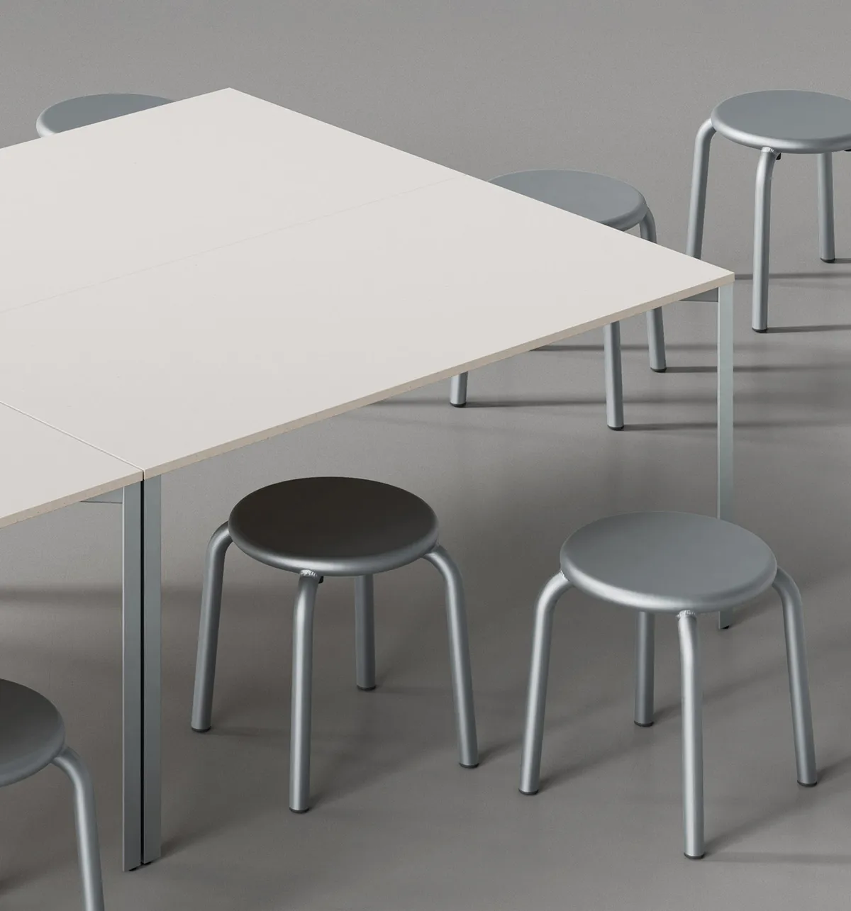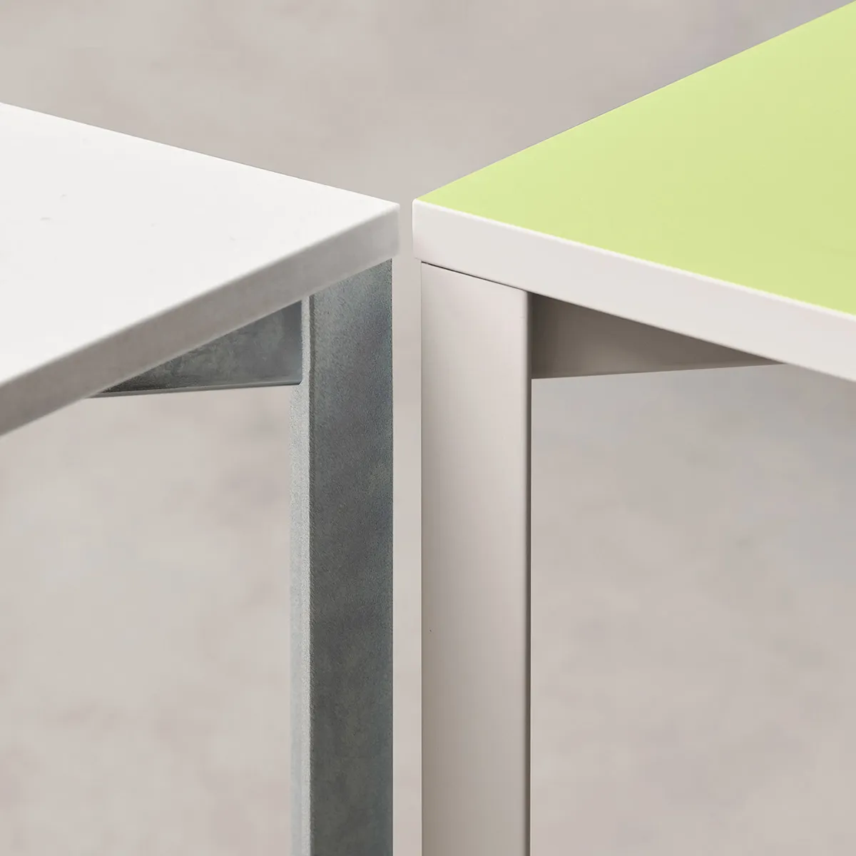 GRID Table Collection, designed by London-based studio Industrial Facility, is the first product in the basic range from +Halle®. Industrial Facility and +Halle® have spent the last two years perfecting GRID, an affordable range of everyday, anywhere tables. Effective as worktops, dining tables, side tables, or desks, GRID tables are easily assembled, lifted, reconfigured and packaged. GRID’s sturdy steel legs are combined with a choice of tops, showcased with Kvadrat Really Textile Tabletop™, an affordable, recycled and circular option made from discarded t-shirts. In multiples, the GRID comes alive, its modular design responding to the emerging behaviours of our public realm. Playfully joining squares and rectangles, colours and tops.