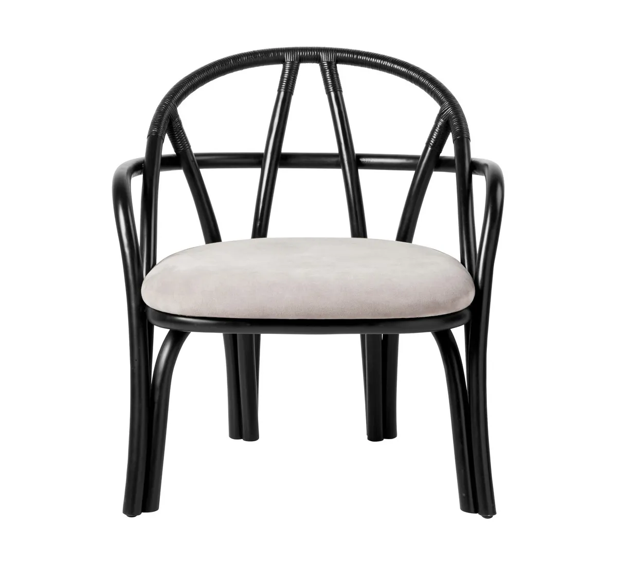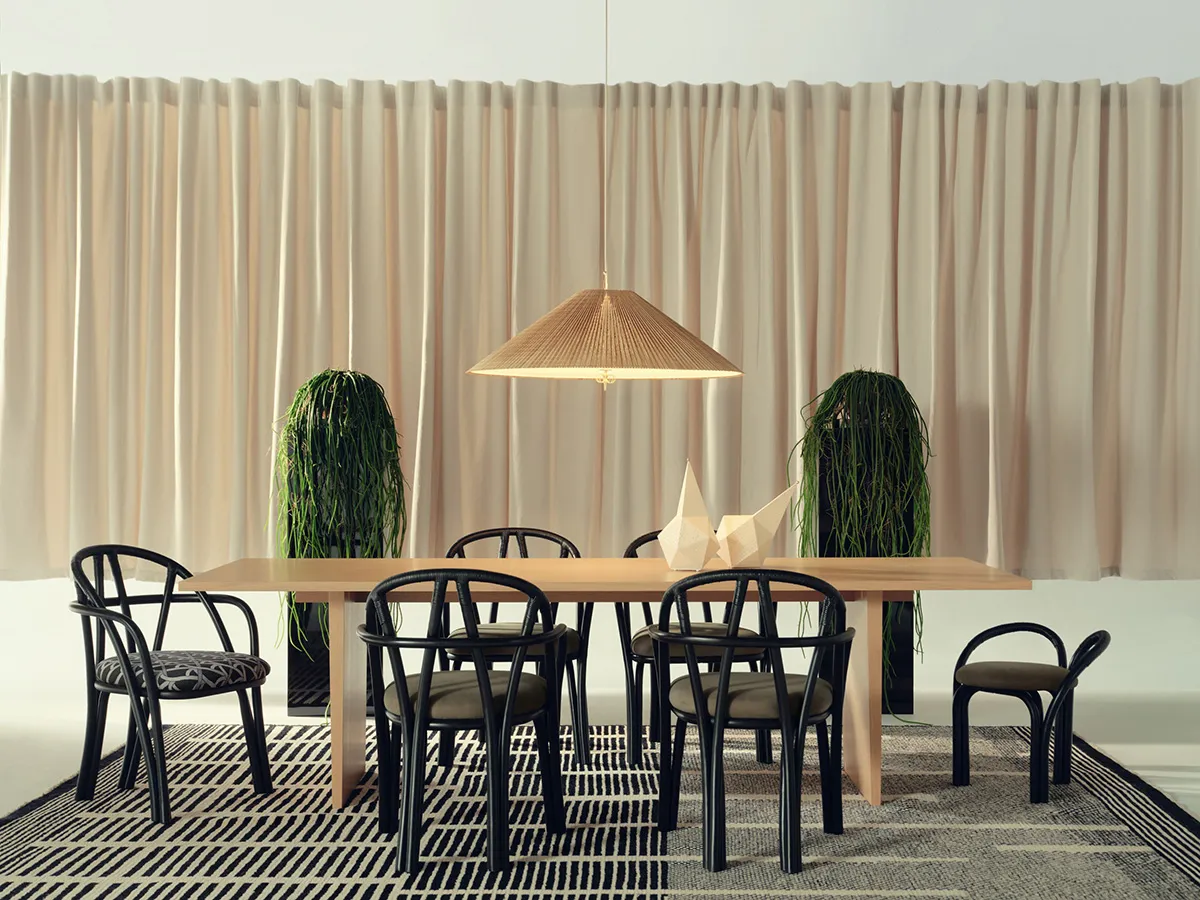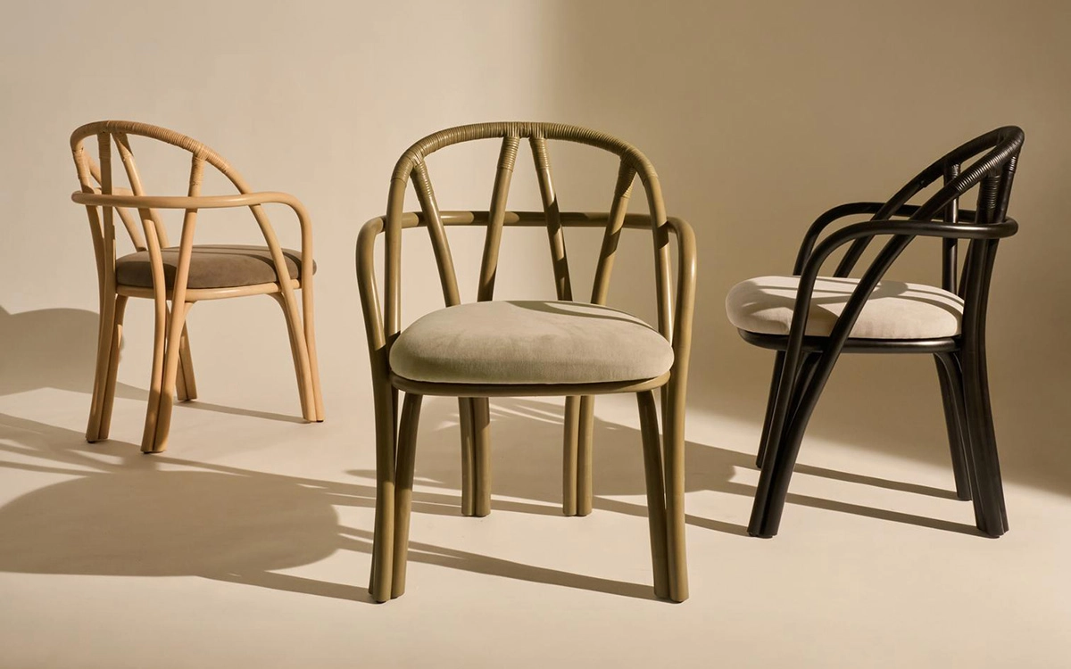 ‘The inspiration for Bistra comes from the plant world: the structural rattan elements emerge from a single point and branch out like tree limbs or fronds. Everything originates from the base, with extending elements transforming into supports for the seat, backrest, legs, and armrests. It is a structure that grows from the ground up, like roots that evolve and transform into the final object.’