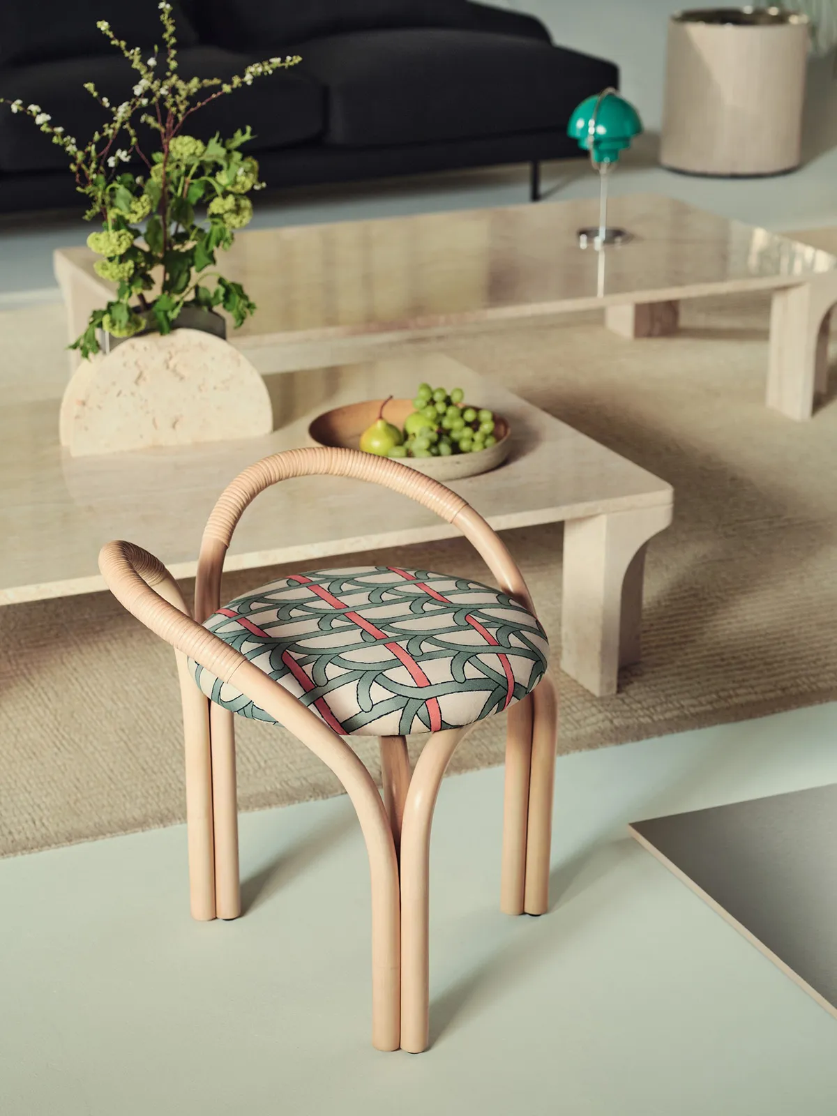 Bistra’s ‘organic growth’ motif extends to Reales Pattern, a custom fabric designed by AMDL CIRCLE for the collection. Reales Pattern is a durable, breathable 100% cotton fabric handcrafted for GUBI in Italy. Featuring a rhythmic interplay of hand-drawn black lines, the printed pattern is inspired by a Leonardo da Vinci fresco on the ceiling of the Sala delle Asse in Milan’s Sforza Castle, adorned with interwoven foliage.