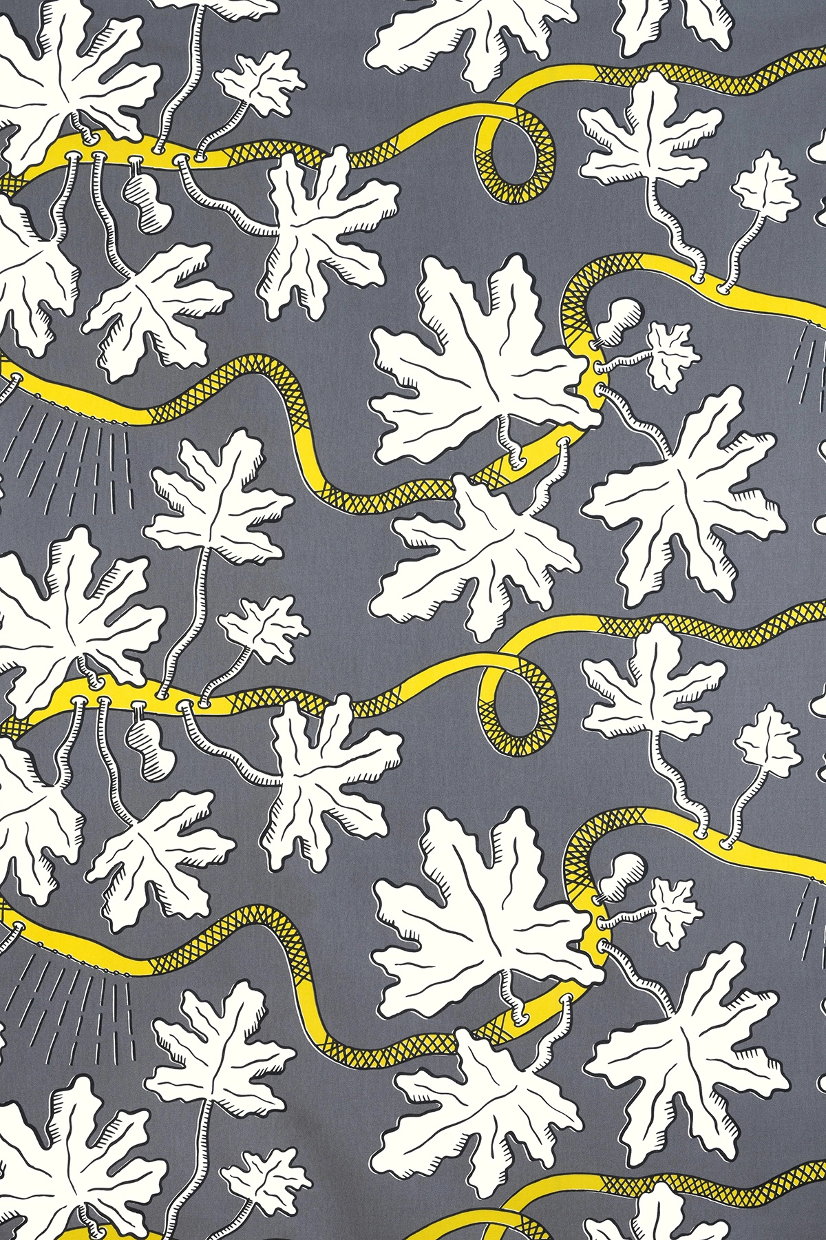 Gunila Axén, Creation, fabric pattern for Röhsska museum, 2007: The pattern Creation is about the first summer on Gotland when Gunila goes around watering her garden so much that it starts to grow out of the hose.