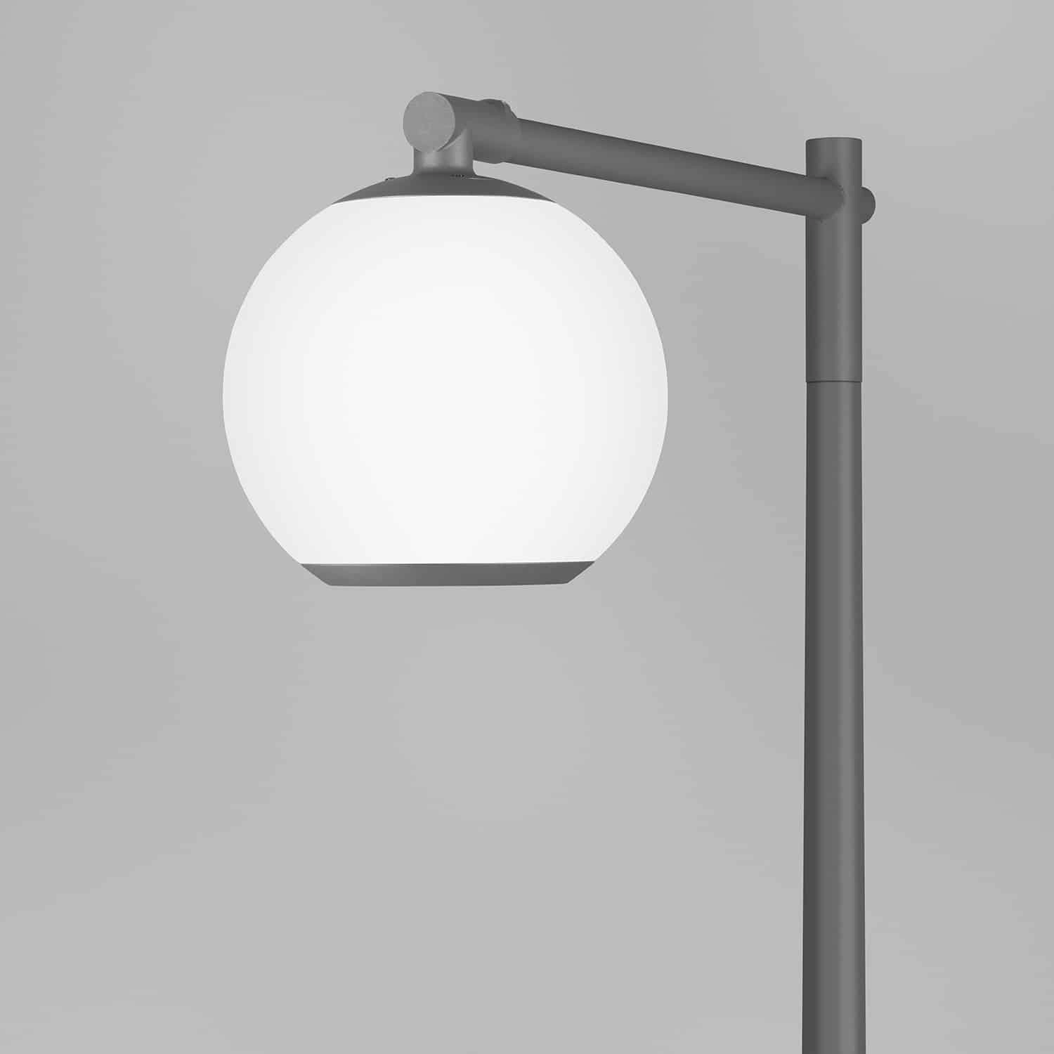 The luminaire is available in two sizes, 600 and 450 mm in diameter. The larger lamp is intended primarily for street lighting and can be suspended from wires or fixed to a lamp post or wall. The smaller lamp is optimized for street and park environments. The luminaire body, wire attachment fitting and lamp post connection are in cast aluminium. The sphere is in pressed opal acrylic well suited to our tough, Nordic climate.
