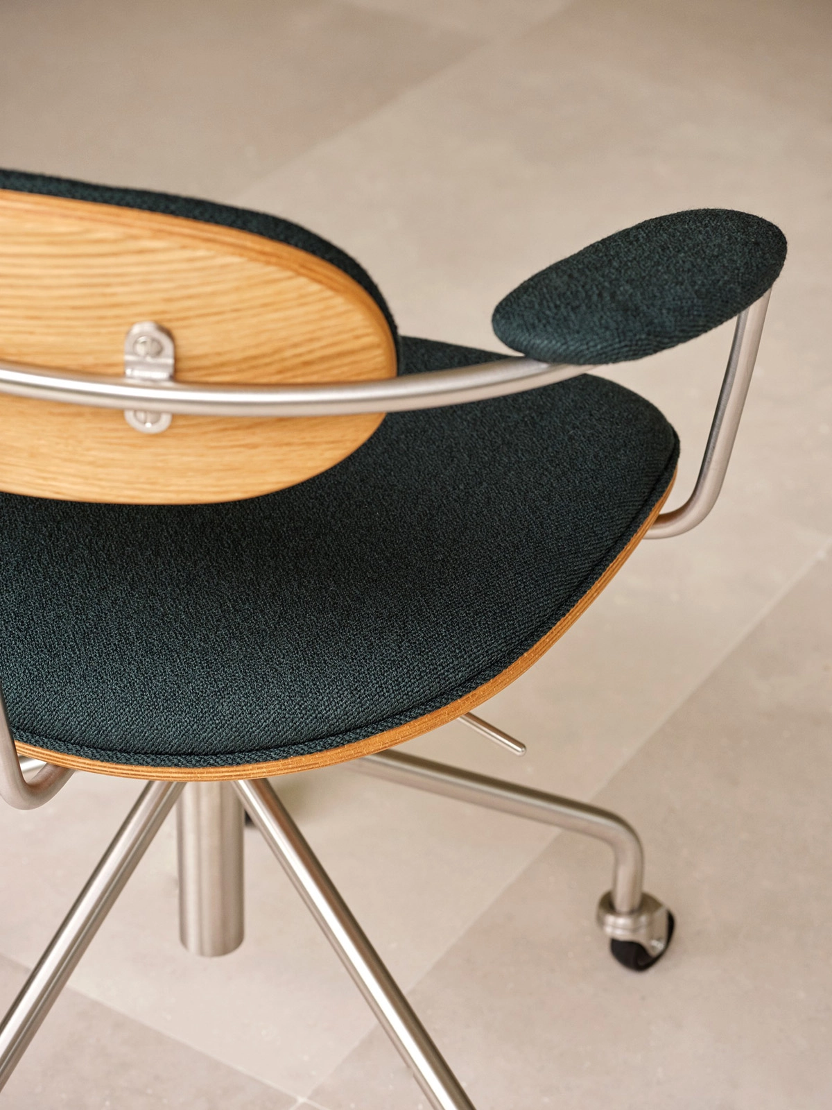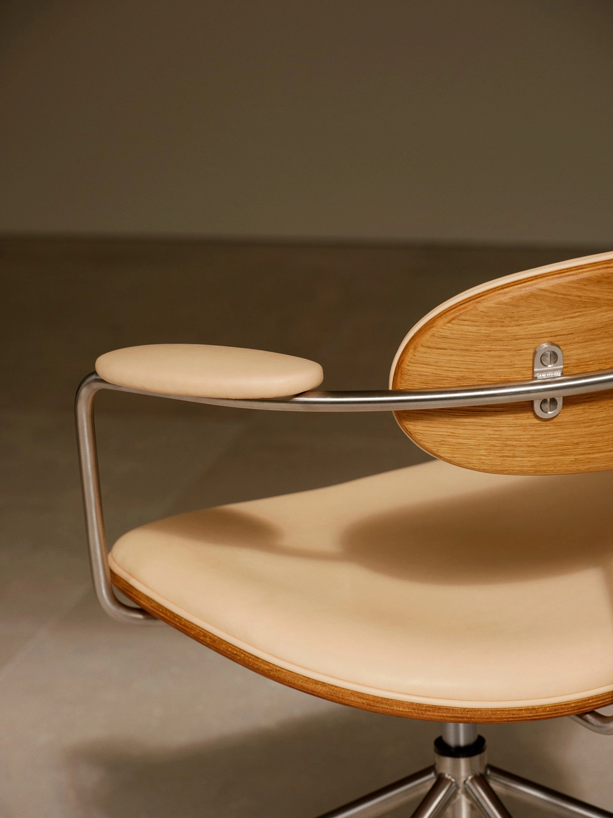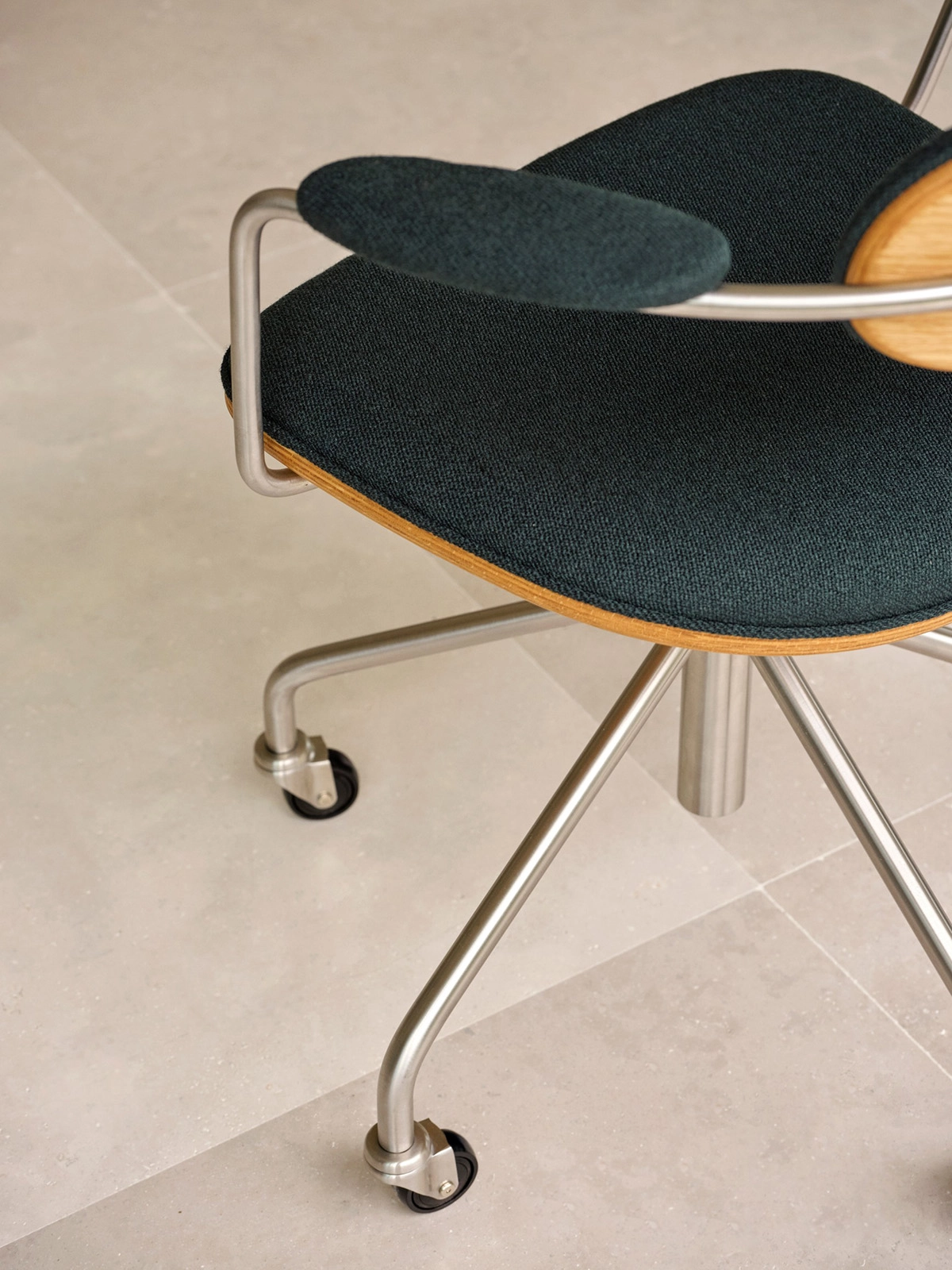 The Swivel Chair has an industrial design idiom, blending a sleek, brushed-steel frame softened by the oak, fabric and leather details of the chair’s seat, arm and backrest. The height of the original version of the chair has been adjusted using a spindle, requiring the user to rotate the seat to achieve their desired height. For a more user-friendly design, the spindle has been replaced with an easy-to-use height-adjustment lever operating a modern gas lift cylinder. In addition, the relaunched chair is equipped with five castors, instead of the original four, to comply with modern stability requirements. Custom castors made of brushed steel provide the finishing touch to the industrial aesthetic.