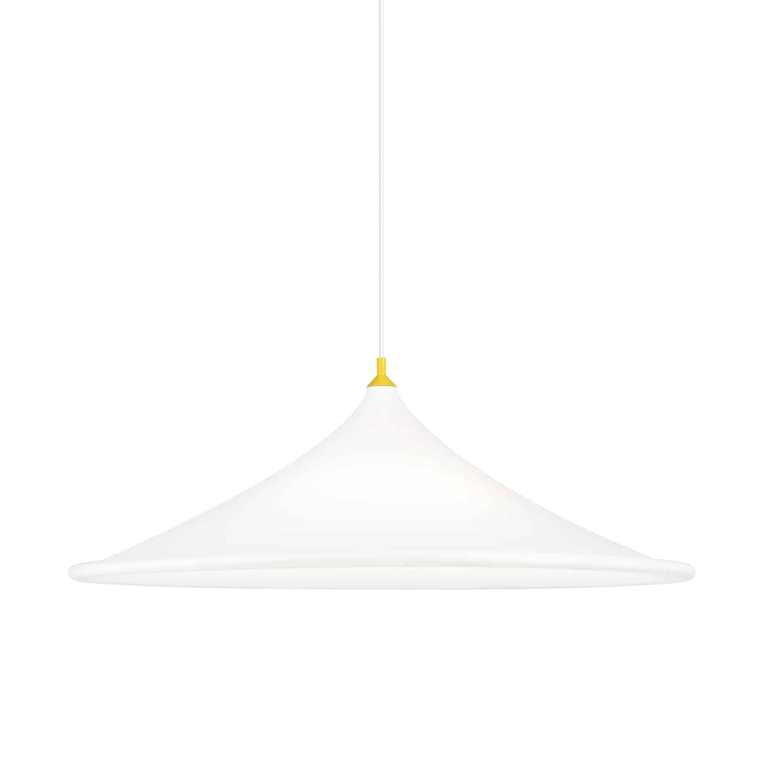 The HATT fixture originated from a desire to use light to create spatiality in a hotel foyer. HATT provides lounge suites with a roof-like structure, thus creating a more intimate atmosphere. Additionally, it is acoustically favourable due to the white stretch fabric that also gives the pendant its characteristic shape. HATT works extremely well in low-ceiling rooms, being just over 30 centimetres high. Details are painted white or yellow. Diameter 800 mm. T5 circular tube 40W.