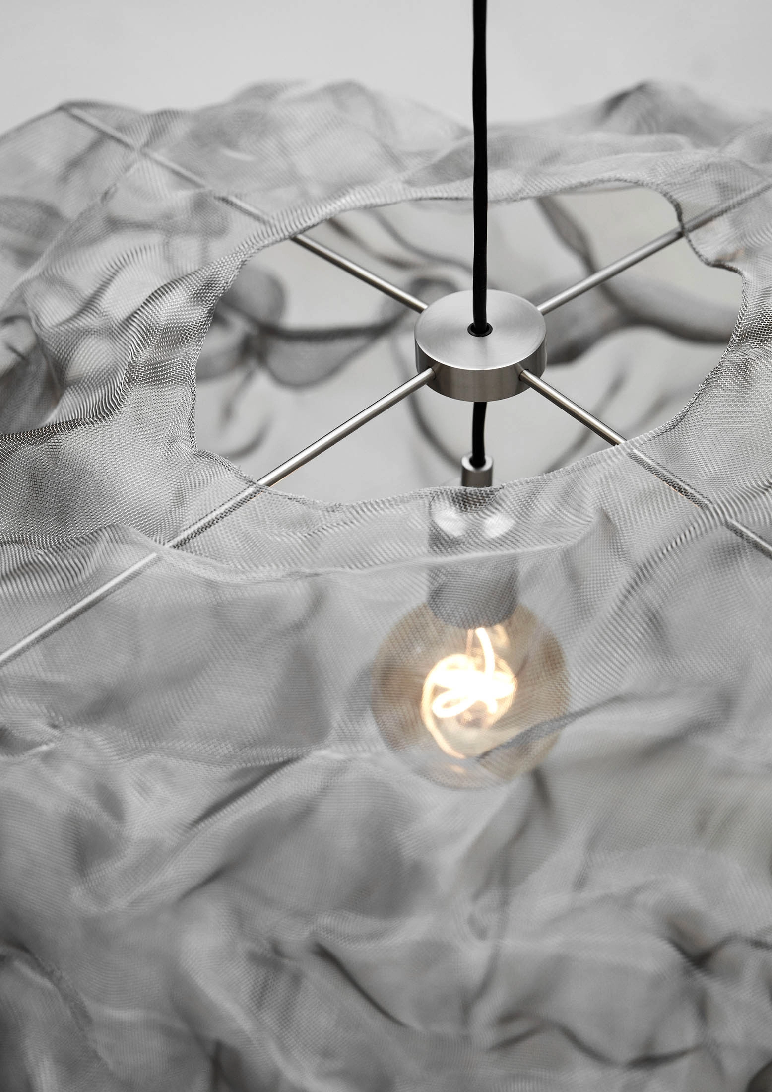 Gleaming metal mesh is the starting point for this sculptural pendant lamp, which resembles a glowing cloud of light when the power source is turned on. The original version was crafted from delicate brass threads, giving the pendant lamp a distinctive golden glow. This season, we are launching a new version made from stainless steel mesh. The new version has a silvery appearance that seems to shimmer as light shines through its stainless steel threads. Both versions are made in a new smaller size, and the original standard size continues to be available.