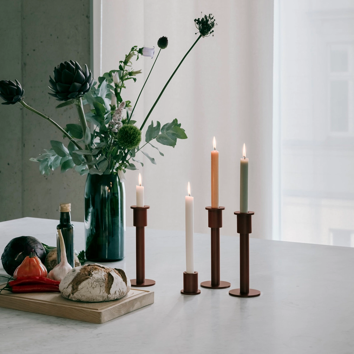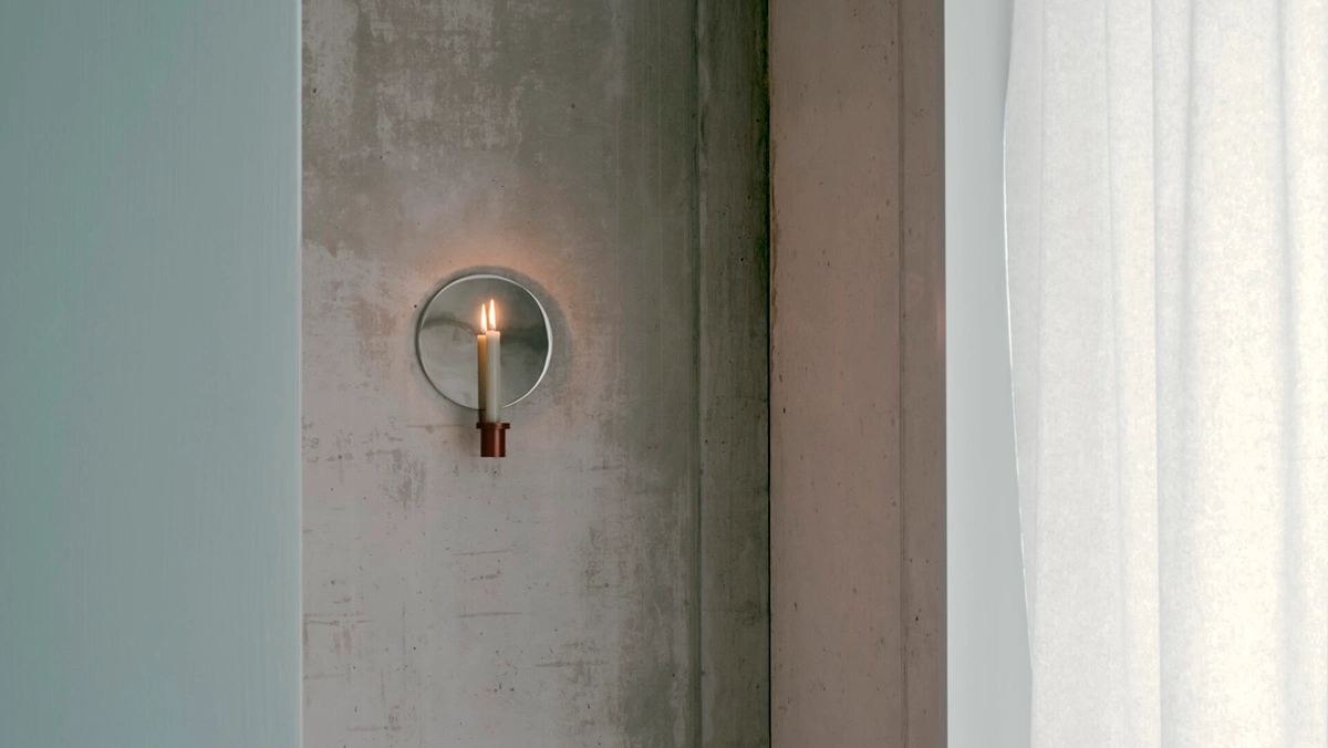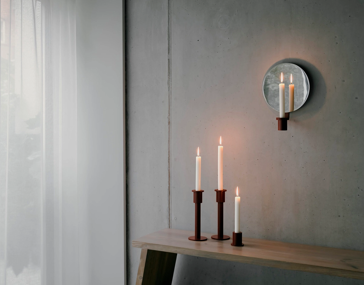 Holocene No. 5 explores the play of reflections, as well as the idea of a simple piece that can be used in different ways. It uses the age-old trick of combining a sconce with a mirror to increase the reflection of light – here in a striking version that is both contemporary and timeless enough for any setting. While entirely crafted from steel, its wall bracket and candleholder are coated with a rich, deep shade of red oxide, creating a bold contrast to the highly polished surface of the wall mirror. The holder can also be removed and used on its own, or with a matching candlestick for added height.