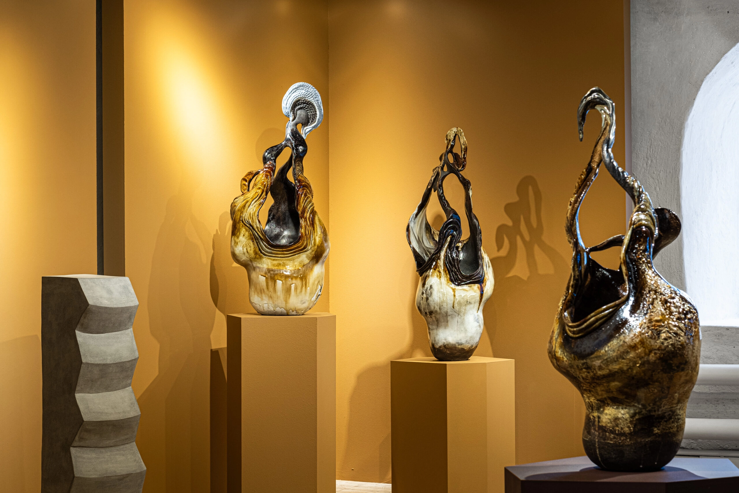 In Maya Strandberg’s workshop, unique sculptures slowly emerge. From a heavy, stable base, they strive upwards, and during the concentrated work with the clay, a hint of a will of its own is awakened in the objects. As if they themselves sought their final form, but in their inadequacy failed to reach the ideal image.
