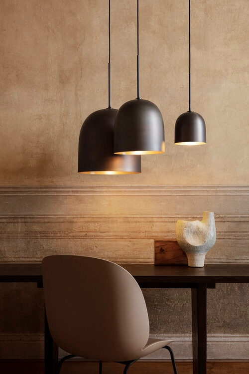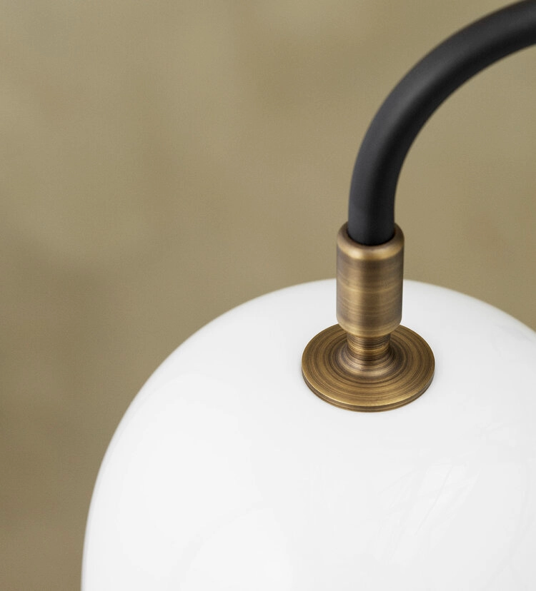 GUBI and Space Copenhagen’s passion for warm, organic materials is seen across the collection. The choice of finishes affects both functionality and atmosphere. One option consists of a brass exterior with a gunmetal surface treatment and a brushed brass interior to create a beautiful, warm, tactile feel, while the solid shade encloses and directs the light, projecting an industrial and functional aesthetic. In contrast, the option of bone china creates a softer, gentler aesthetic and casting the light in a more ambient manner.