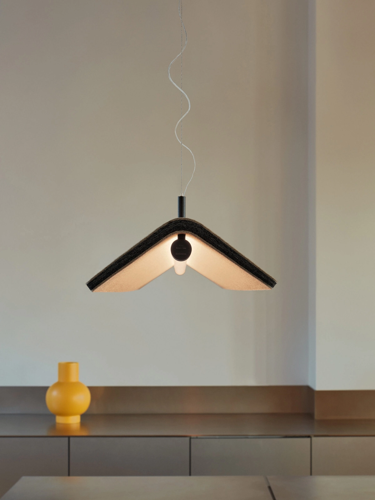 A clever thing about Vika is that both the floor screens and the ceiling luminaire are designed to be close to those in the room who are its sound sources. This stops sound waves before they can bounce off the walls and ceiling.