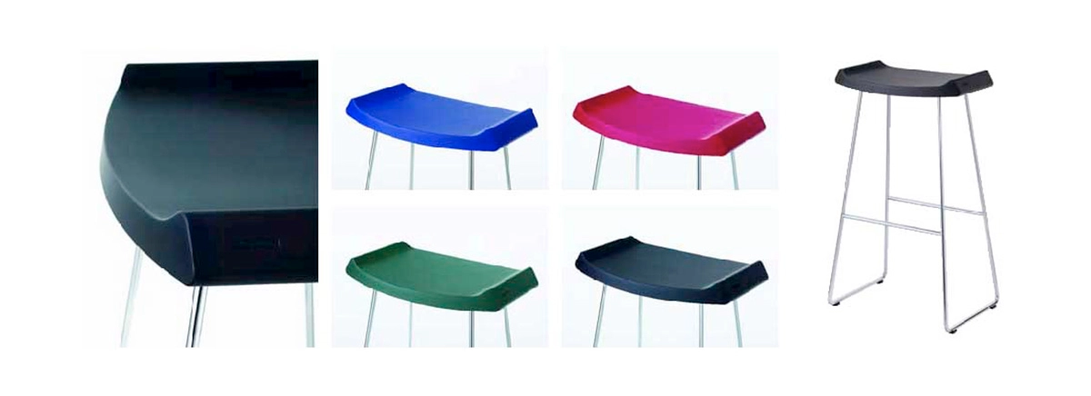 Performance: Bar stool with seat in PUR, black, blue, red or green. Chassis in chromium. Height 81. Width 49. Depth 35. Seat height 79 cm. Weight 6 kg.