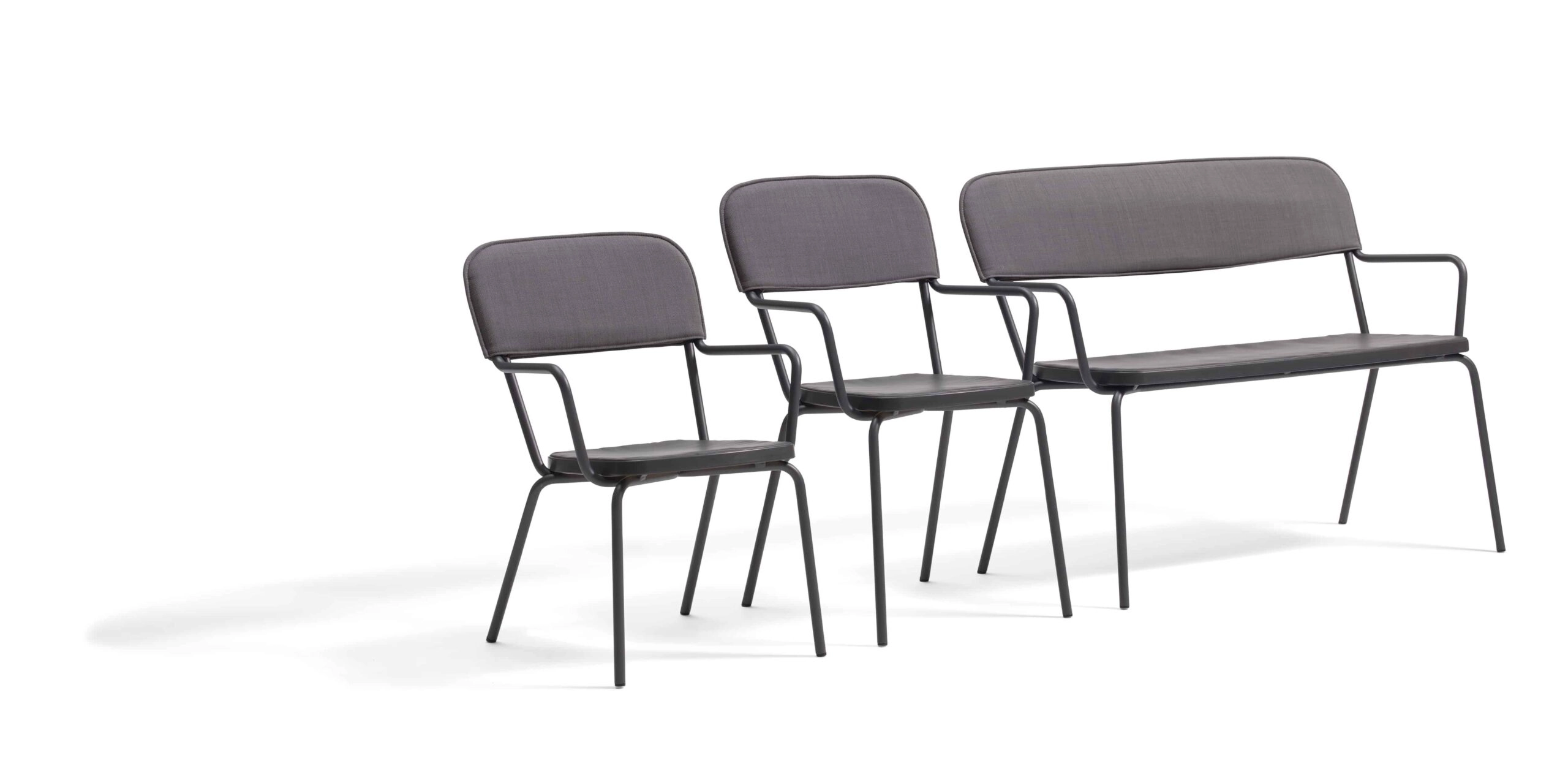 The Kaffe family comprises chair, easy chair and sofa. They are all stackable and can be given a small “cap” or for a softer feeling, if wanted. In addition there is several versions of Kaffe Table in two heights.