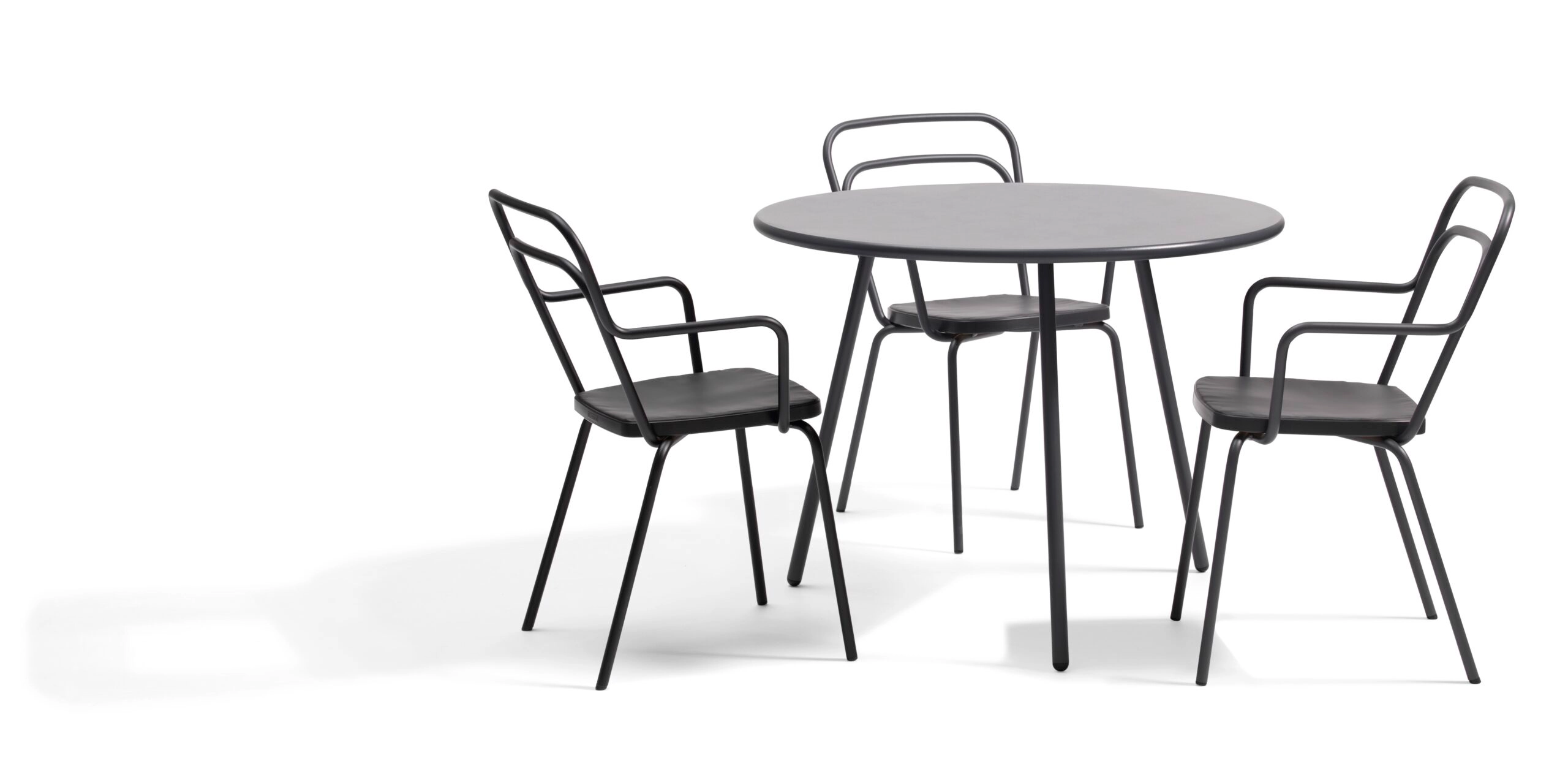 Frame in galvanized and lacquered tubular steel. Seat of moulded polyurethane foam (PUR). Kaffe table can be dismantled. Legs of galvanized lacquered tubular steel. Tops of solid wood or powder-lacquered outdoor grade MDF. Plastic feet.
