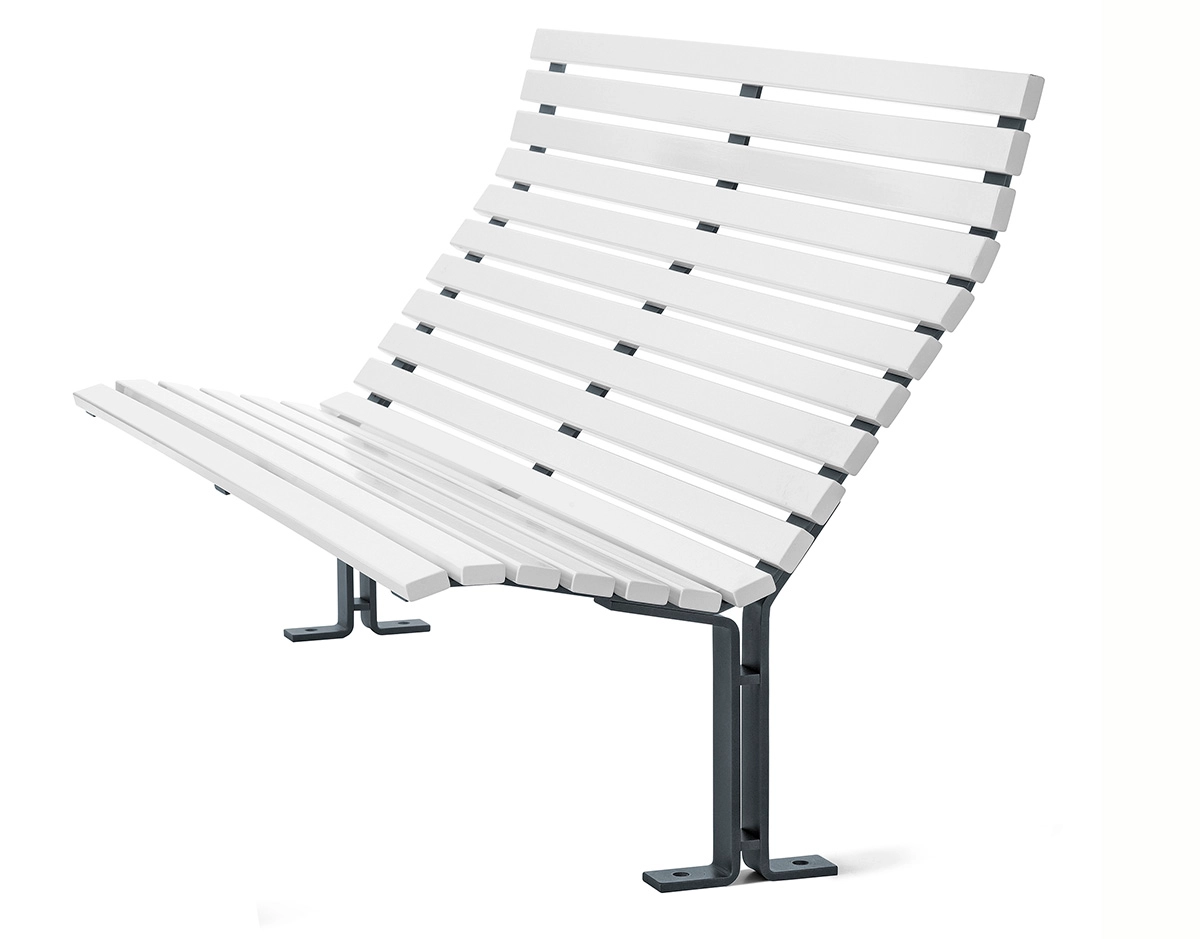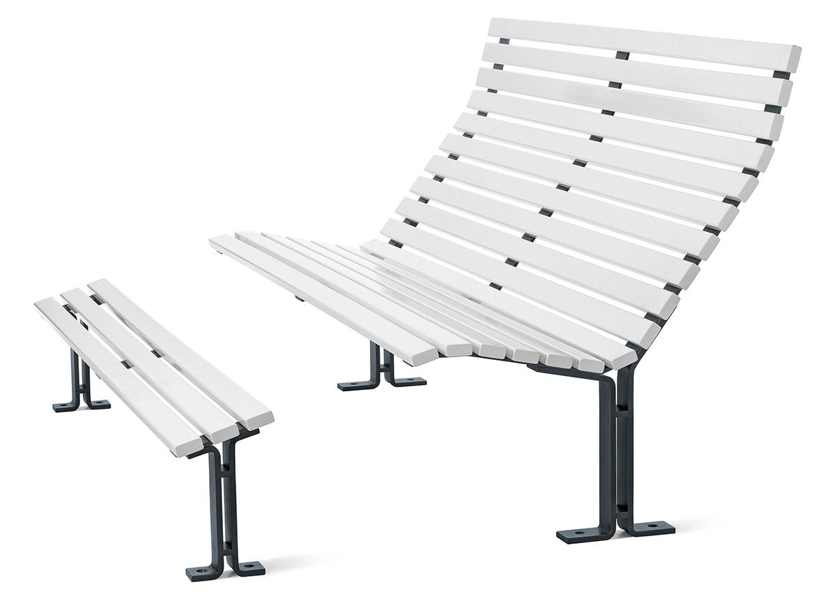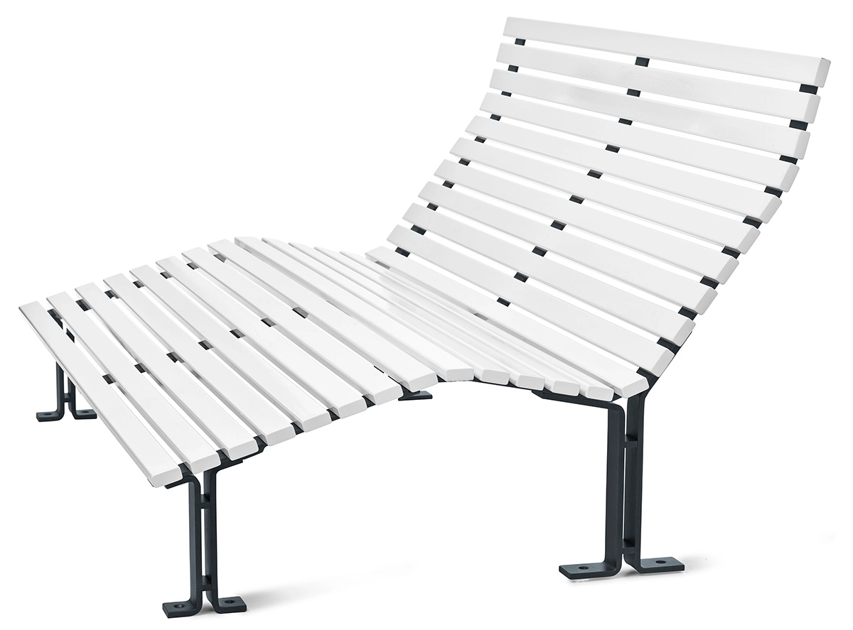 Conventional wooden slats form the seat and backrest of this undulating bench, but its design is completely unique. Crafted in an expressive, swooping form that balances atop three structural supports, the bench is made with maximum comfort in mind. One of the first park benches to be accompanied by a footstool, the design invites those seated to put their feet up, or just sit back and relax. The laid-back luxury of this bench makes a unique addition to any public space.