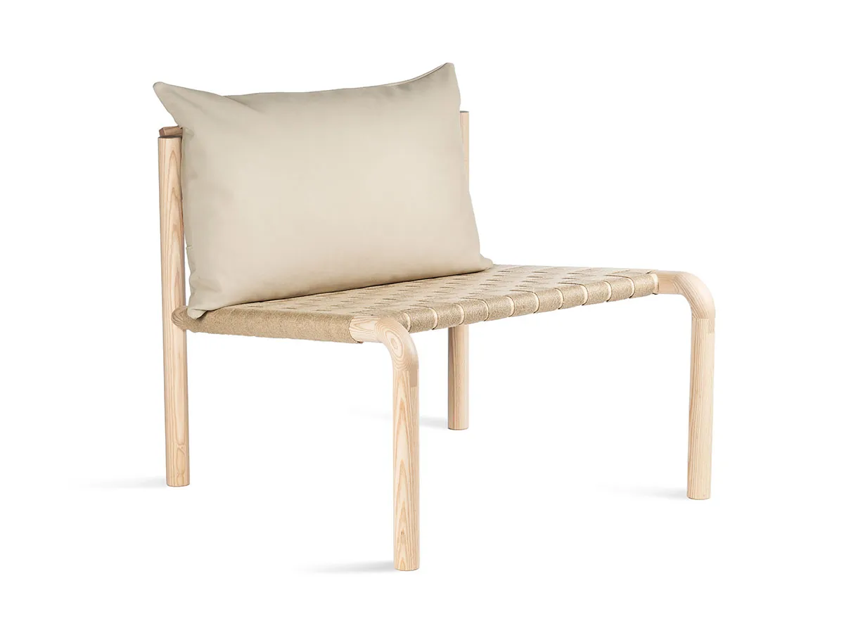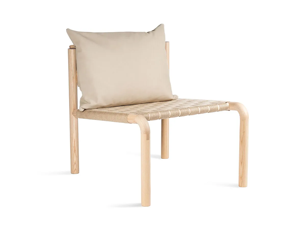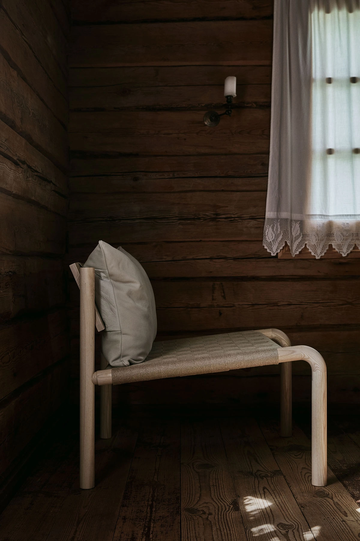Kaski was born from a need to create variation and personality in public spaces. “Customers are currently interested in Finnish furniture. In terms of lounge chairs, there are not so many options aside from the classics”, says Laajisto. Finnish countryside aesthetics also echo in the chair’s materials. The linen weaving is reminiscent of traditional handicrafts made of woven birchbark, and the backrest made of ash tree is simple yet stands out. The rugged beauty of the chair is softened by a large nubuck leather pillow. “I often look for a luxurious element to balance out a minimalistic design.”
