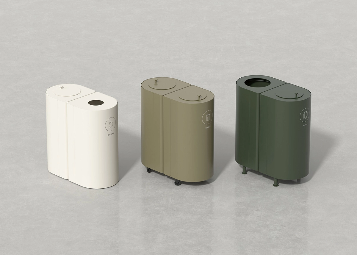 KLOSS design concept includes three steel modules with different shapes and visual properties to be used singly or in various groups and creative formations. All modules are prepared to be elevated on adjustable legs or on wheels, and to be equipped with a range of different open tops and a soft-closing lid. Every unit has an integrated bag holder and can be complemented with a separate inner container, to prevent leakage and to help reduce the use of bags. All connected modules can easily be disassembled, and regrouped into completely new formations – at any time!
