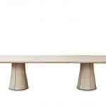 “The sculptural shape is functional. A central leg provides generous support on the floor, tapers to give legroom and lightness, and then broadens out again to take the table top. By adding more columns you can build tables of any length and with no legs getting in people’s way.”