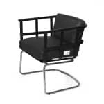 Stålstativ i krom eller koppar. Formpressat sittskal, kuddar i dunblandning.