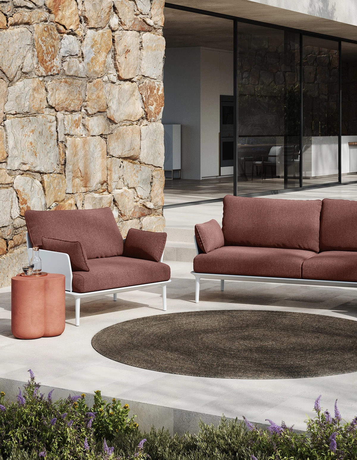 The Mioro Outdoor rug is constructed with braided polypropylene ropes and combines a plain weave with the intricate ‘leno weave’ – a newly introduced technique in the art of rug making. The leno technique requires modifying the loom and using special shafts to twist warp threads. This unique technique forms small openings in the rug, arranged in a stripe pattern, giving it an airy, textured look. The end result references textured surfaces, says designer Margrethe Odgaard: “The leno weave element is a detail that runs through Mioro, like the striped pattern of a knitted jumper, or cracks in the earth.”