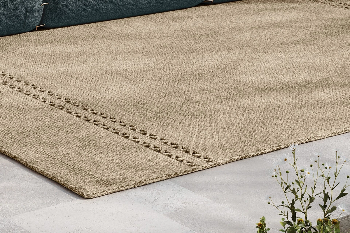 The rugs are designed to perform in a wide variety of outdoor placements and offer high resistance to humidity, sunlight, mildew, and ocean or pool water. Constructed from man-made fibres the rugs are water-repellent, tear-resistant and fast-drying. These stable and maintenance-friendly properties make the rugs equally suitable for use in interior environments. The polypropylene is solution-dyed, reducing water, dye, and energy consumption in production, requiring no additional performance chemicals and ensuring colour fastness.