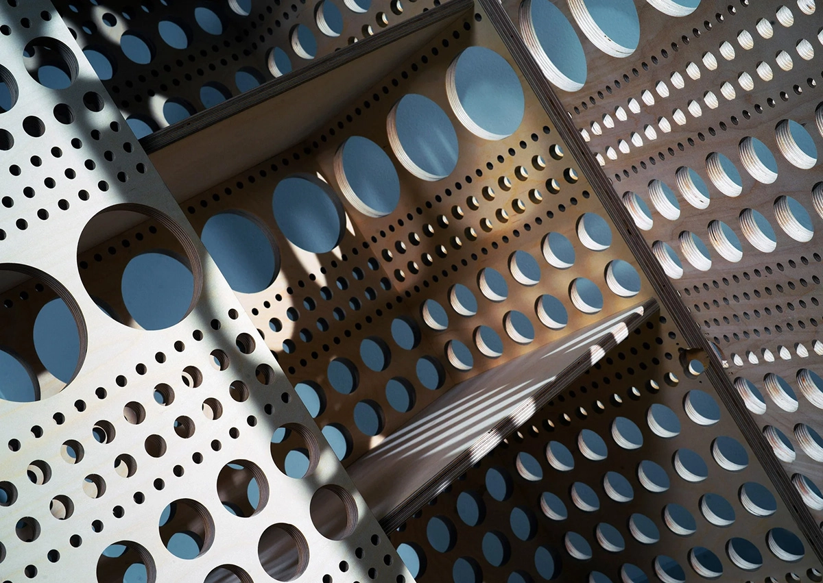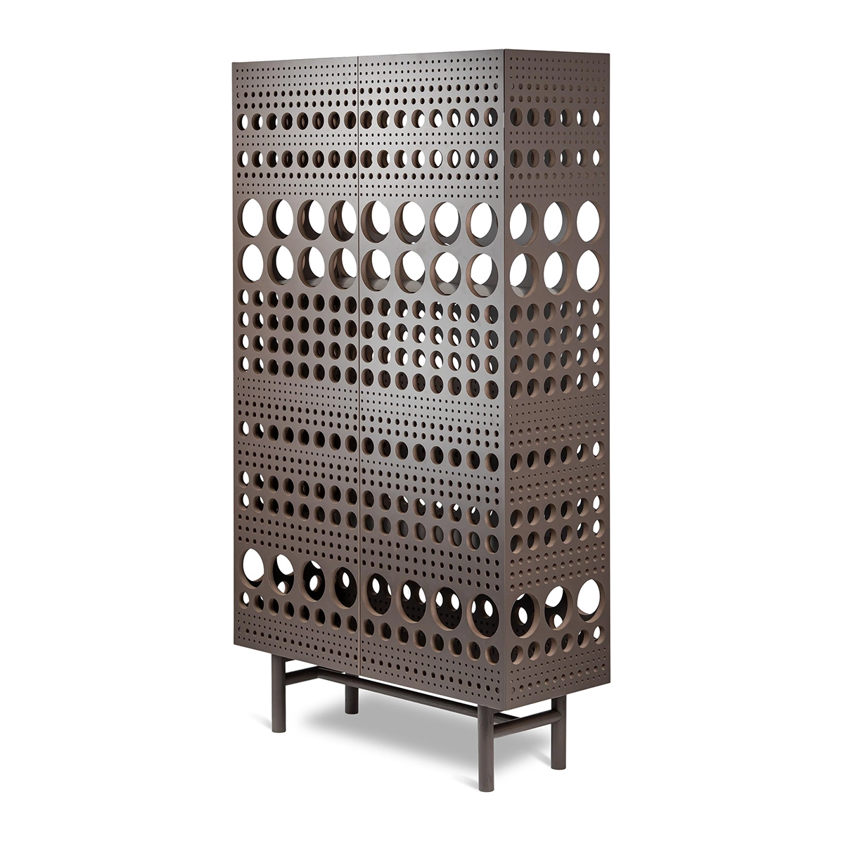 The Laulu cabinet created with swedish designer Matti Klenell is intended for storing, displaying and room dividing. All four sides of the cabinet is covered with a perforated pattern consisting 3296 holes that gives the volume a semi-transparent appearance. The cabinet is constructed from CNC milled Valchromat board with a base in solid wood.