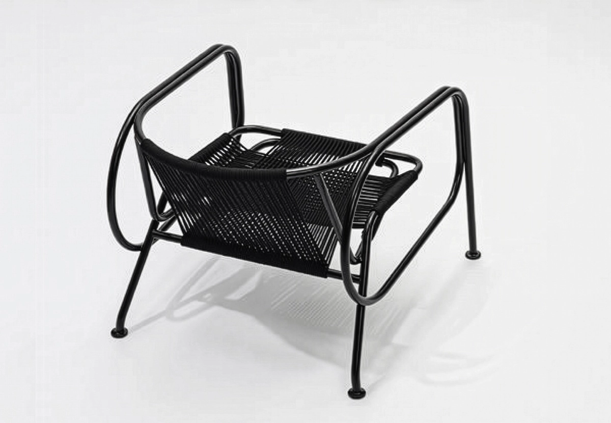 Exhibition: SE16 “Pitch Black”. Made with 3D bended tube frame, hand woven seat and bag in flag halyard. The prototype is made with: TL Maskinfabrik Aps. and Aarhus Possementfabrik A/S.