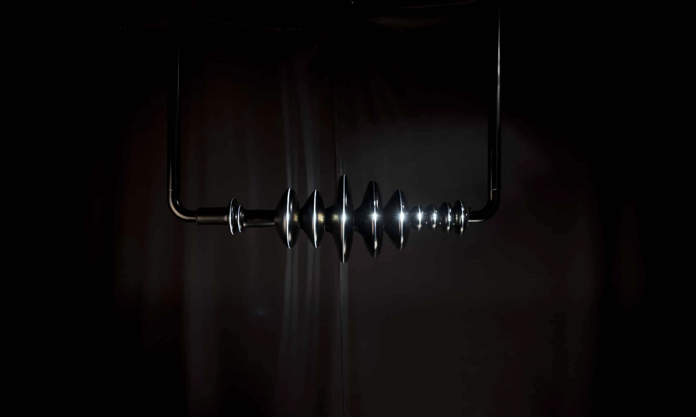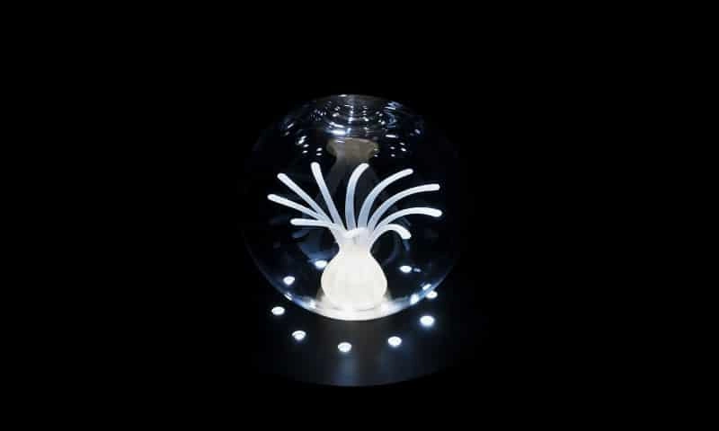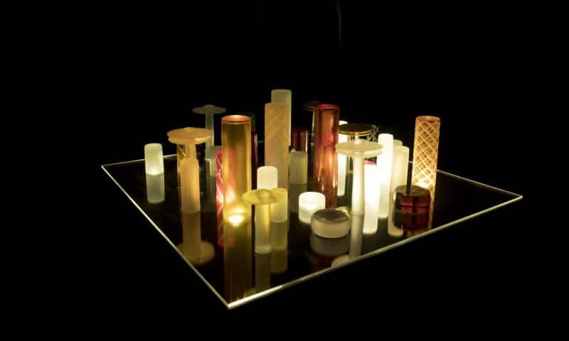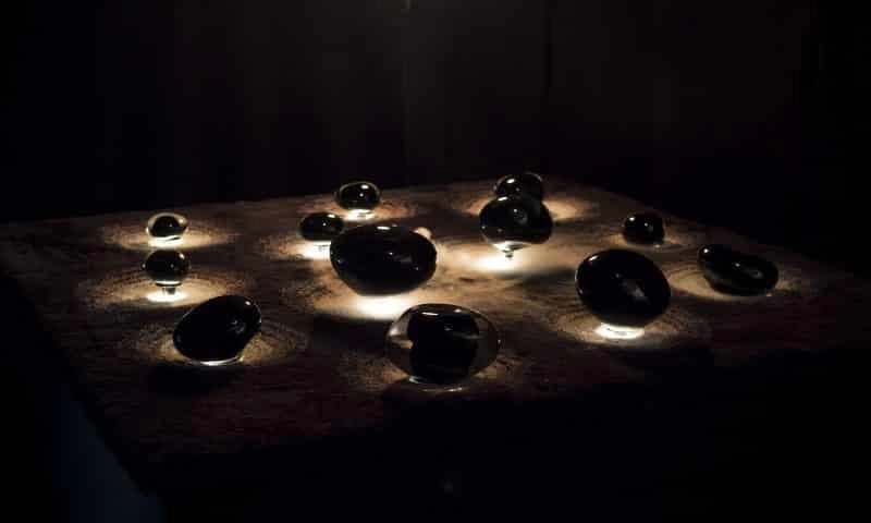 The first sketches presented the globe on its journey prior to explosion. The installation evolved throughout the project into a bubbling volcanic creation, where ten stones of glass slowly move up and down in conjunction with the music. When the stone rises upwards, the light comes out and brightens the area surrounding it. The stones are resting on a handtufted rug with craters surrounding each individual stone.