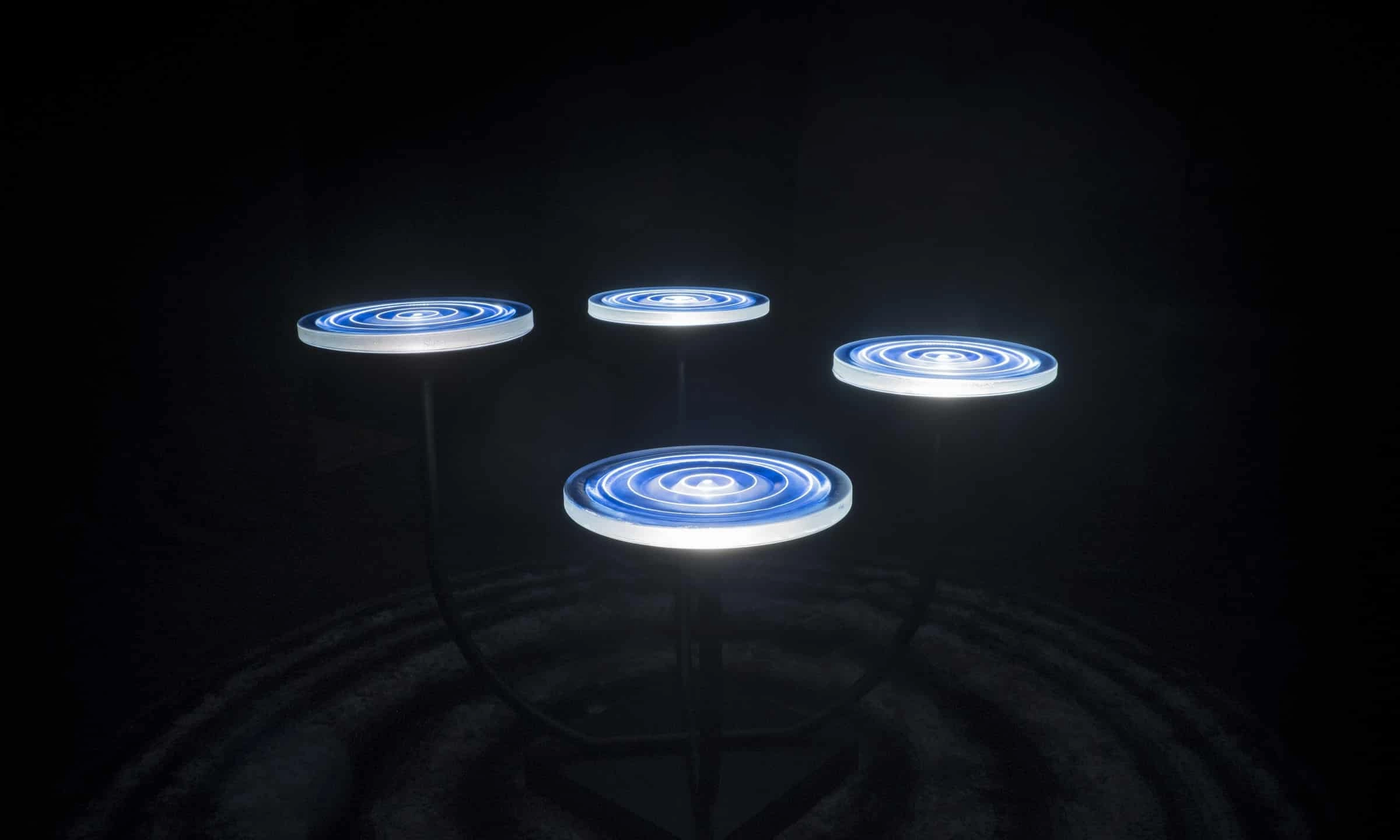 A drop of water in a sparkling summer lake sets the shape of this installation. The sound of leaves flickering in the wind and the sun reflecting in the deep blue water. Four dark blue glass plates float in the air in a wave pattern, similar to the one moving after the landing impact of a falling water drop. The light inside the plate moves in the same direction as the waves. On the floor accompanied by a handtufted dark blue rug with a similar three dimensional wave pattern, shading itself brighter when reaching the wave peak.