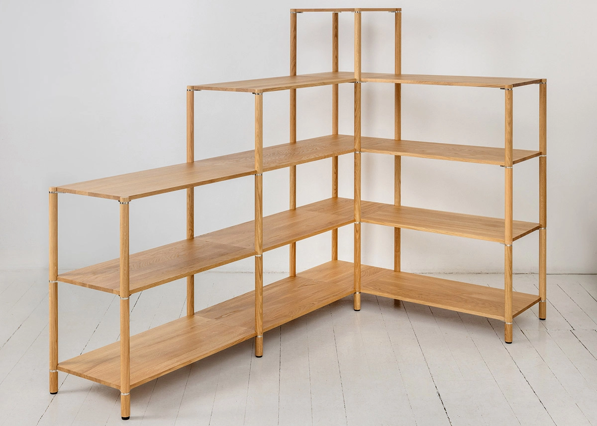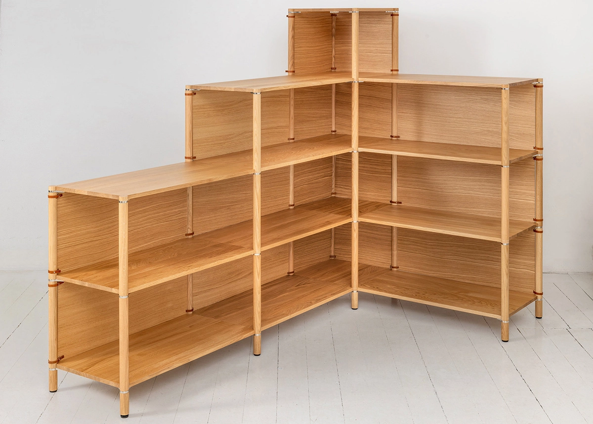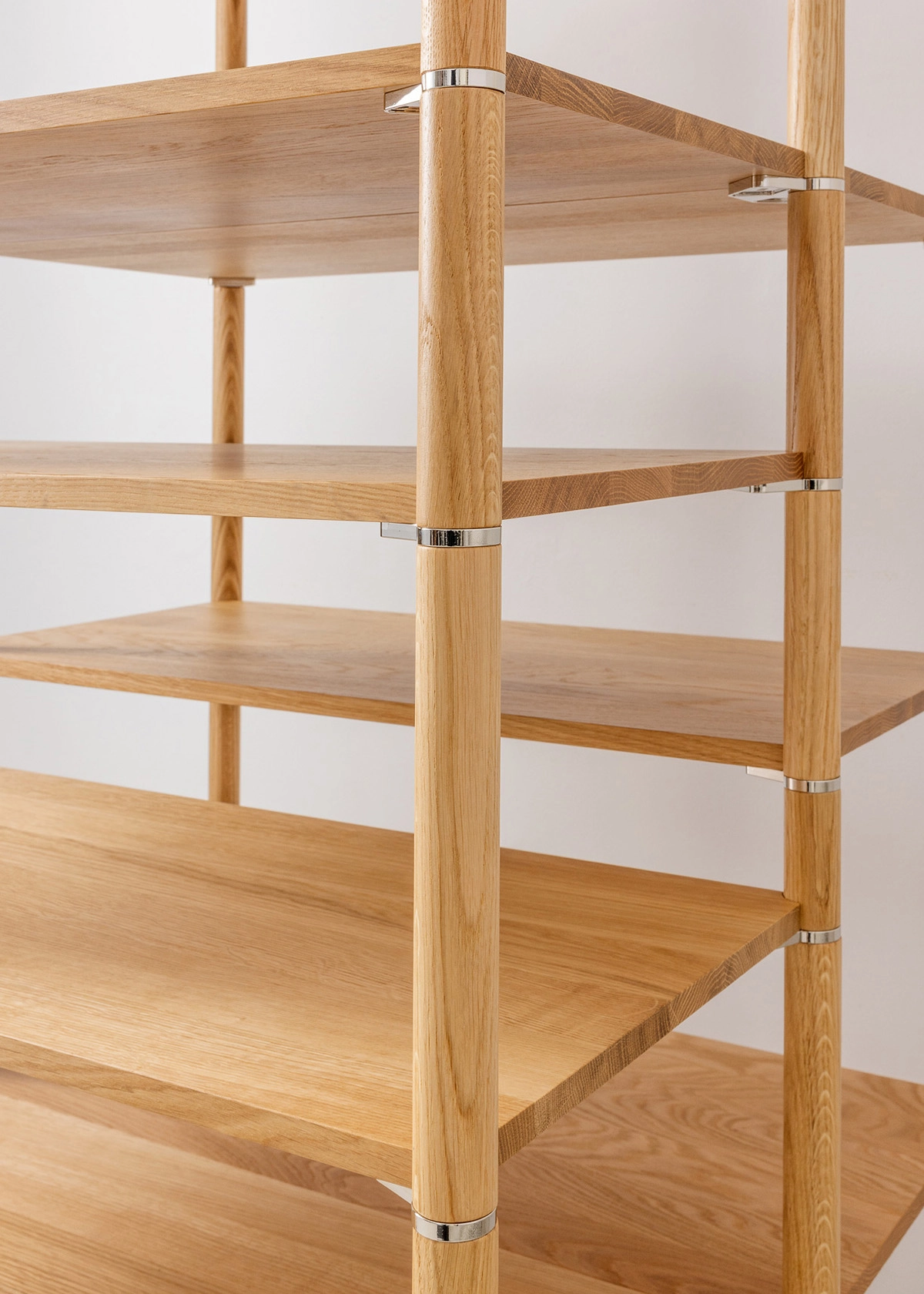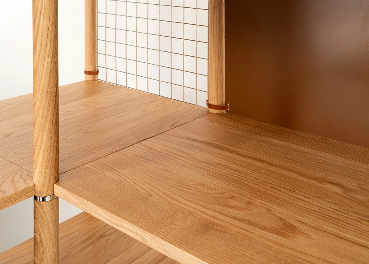 The solid oak pillars come in various lengths, allowing for endless creative combinations. The shelves, made of solid oak, are available in rectangular, square, and wedge shapes, giving you the freedom to angle and adjust them just the way you like. As accessories, there are wooden walls, painted sheet metal, or metal wire panels, all attached with elegant leather straps.
