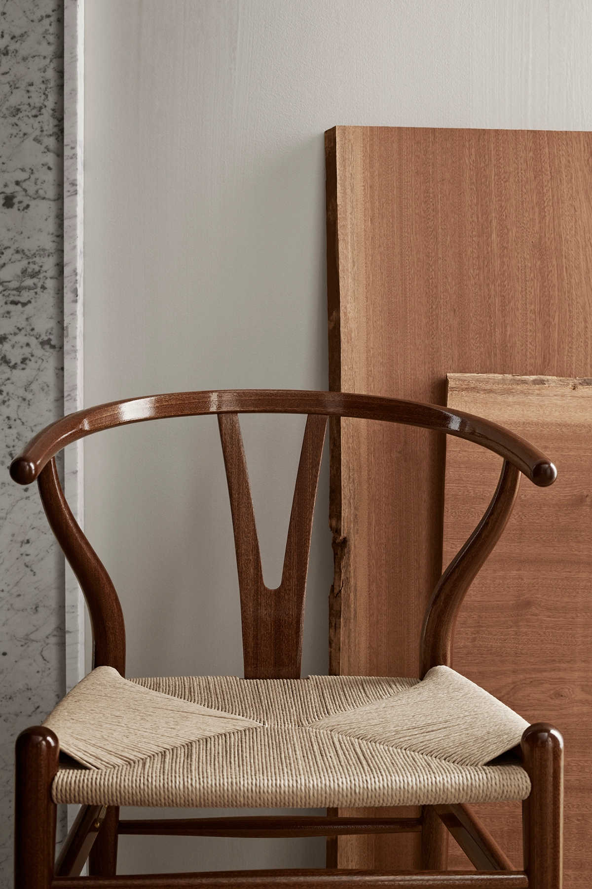 To celebrate Hans J. Wegner’s impressive legacy, this year’s specially made Wishbone Chair will be produced in a limited special edition from certified mahogany, an exclusive and noble wood which is well known for its deep, uniform colour. Historically, mahogany has been used to make furniture since the 15th century, and during the 16th and 17th centuries the exotic wood was the preferred material for furniture-making, particularly on account of its strength and stability. The Wishbone Chair in mahogany has a beautiful surface with reddish-brown hues which are accentuated and protected by a strong highgloss lacquer that gives the chair a shiny finish. The special edition has a small brass plate engraved with Hans J. Wegner’s signature and date of birth discreetly placed on the inside of the chair frame. It also comes with a certificate of authenticity.