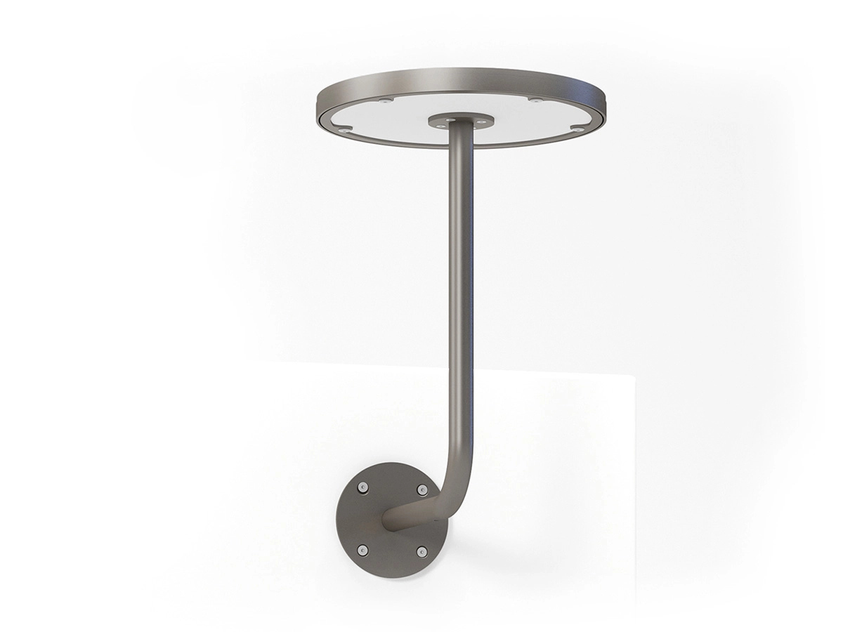 Ljusnan is an attachable small table with illuminated bottom that can be mounted to other products, such as walls, standalone benches, or other fixed installations where a tray or surface is needed for placement of everyday objects or support.