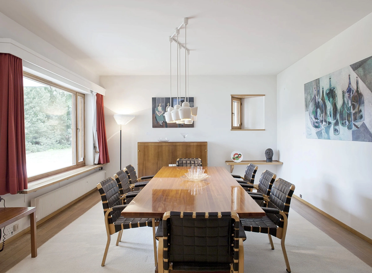 While credit has historically been ascribed to Alvar Aalto, he was supported by a small and highly skilled team at the Artek office and his architectural studio. As well as supervising construction, Elissa Aalto designed a series of understated yet inviting wool carpets and rugs that cover the oak and tiled floors. Meanwhile, Artek’s chief designer Maija Heikinheimo oversaw the provision of a wide range of Artek furniture. Alongside standard pieces like Armchair 45 and X-leg models, the living room showcases bespoke creations such as a “piano” coffee table made from ash and a “spaghetti” armchair. Designed by Heikinheimo from moulded wooden strings, this latter piece became a favourite of its owner—Carré sent Alvar and Elissa Aalto a letter mentioning “the special wing chair has arrived in perfect condition and we can’t stop looking at it”.