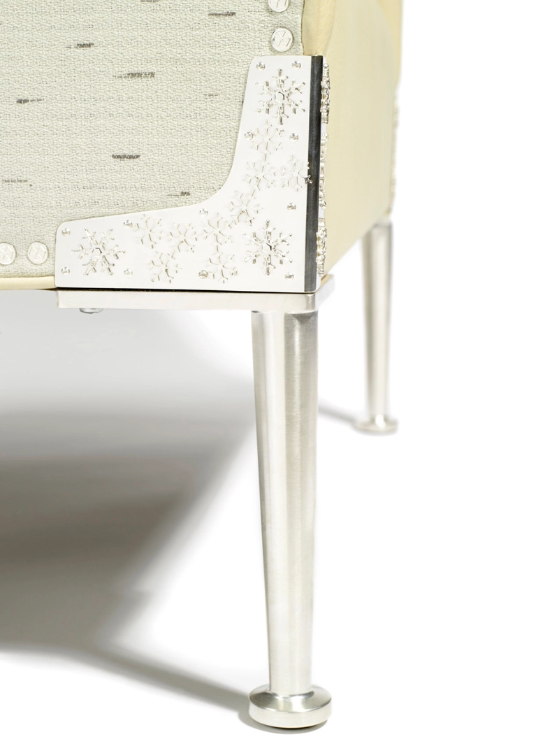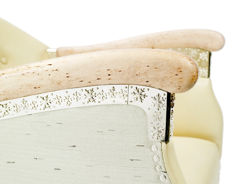 Norrsken berättar om ett ljust och naturnära Sverige. Temat är snö och björk. Materialen är läder, silver, väv och masurbjörk. Färgerna är vitt, svart och silver. Fåtöljens utsida är en specialgjord väv från Uddebo-väveri. På utsidans vita väv finns svarta stråk som ger betraktaren en bild av björknäver. Ovanpå björknävern faller snöstjärnor i silver, som i ett svenskt vinterlandskap. Kring fåtöljens utkanter följer vackert ornamenterade silverbeslag från hovjuvelerare W A Bolin. Fåtöljens insida är vit i nysnömjukt läder från Elmo Leather. Armstöden är följsamt formade i masurbjörk. Fåtöljen är i sin helhet byggd av rena naturmaterial och tillverkarna lovar livstids garanti.