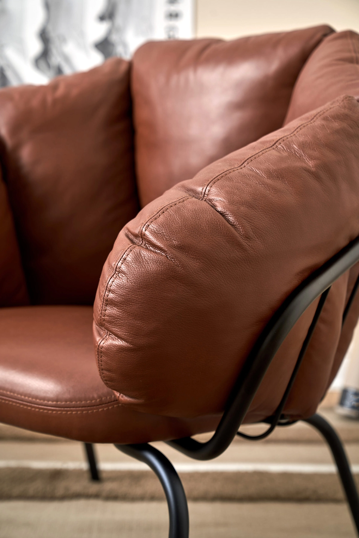 Louise has placed great emphasis on sustainability and material selection. Same Easy is designed to be easy to maintain and reupholster when needed. The comfortable and puffy back cushion is sewn in compartments with a zipper underneath so that the inner cushions can be replaced. The back is also both removable and reversible, which means it can be worn from both sides. The metal frame is powder-coated and made in Småland by Steelnova in Vaggeryd, and the upholstery is made of leather from Swedish Elmo Leather.