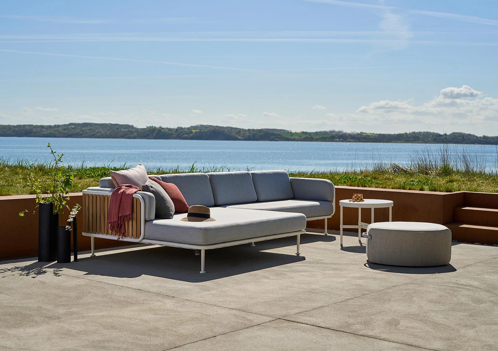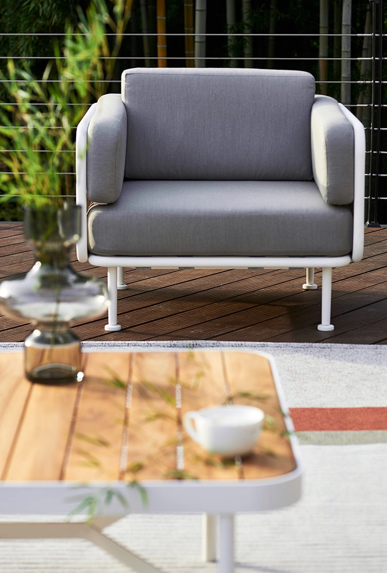 Our popular and modular lounge group will fit in and stand out no matter the setting. The combination of the durable aluminium frame and the certified teak sides creates a warm, soft-shaped, and very exclusive look. To achieve the same superior comfort as in a high-quality indoor sofa, the cushions are built with layers of memory foam. Due to an inner membrane and high-quality fabrics, the cushions are weather resistant and can be left outside even during summer showers. To complement the mindo 100 collection, add matching coffee and side tables. Available in warm grey or off-white.