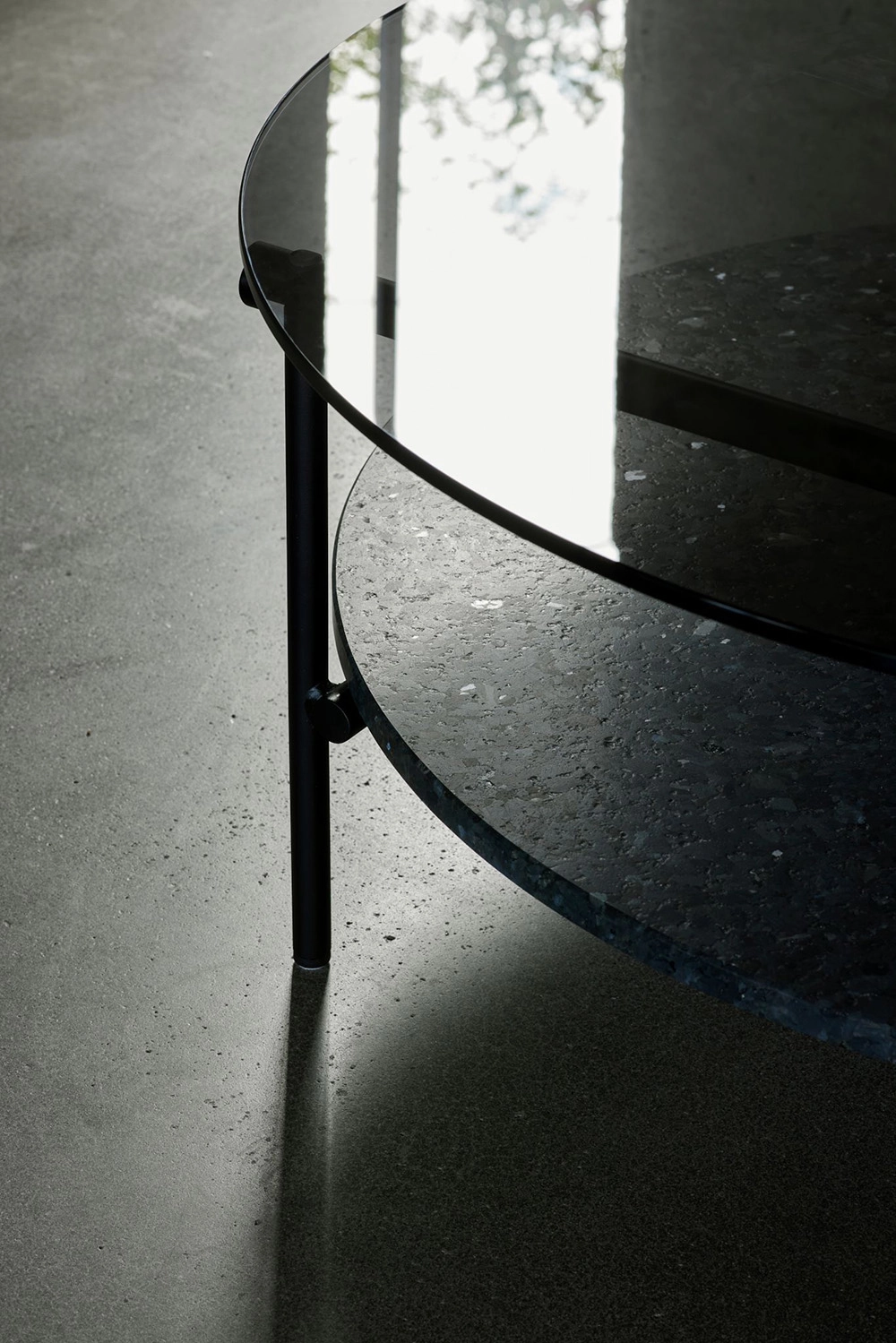 “We originally designed Mio to complement Hjelle’s Ami sofa program; however, as the family of occasional tables developed, they immediately took on a life of their own. Featuring a lapped steel framework that supports two circular planes, Mio simultaneously references modernist architecture with its daring cantilevers and the primitive legibility of Enzo Mari’s Autoprogettazione. The table surfaces are available in a range of materials that include a softly profiled solid oak, tinted glass and Larvikitt granite, the iconic Norwegian stone instantly recognized by its crystalline structure. Additionally, Mio comes flat packed and is assembled in minutes with just a few screws.” – Takagi/Homstvedt