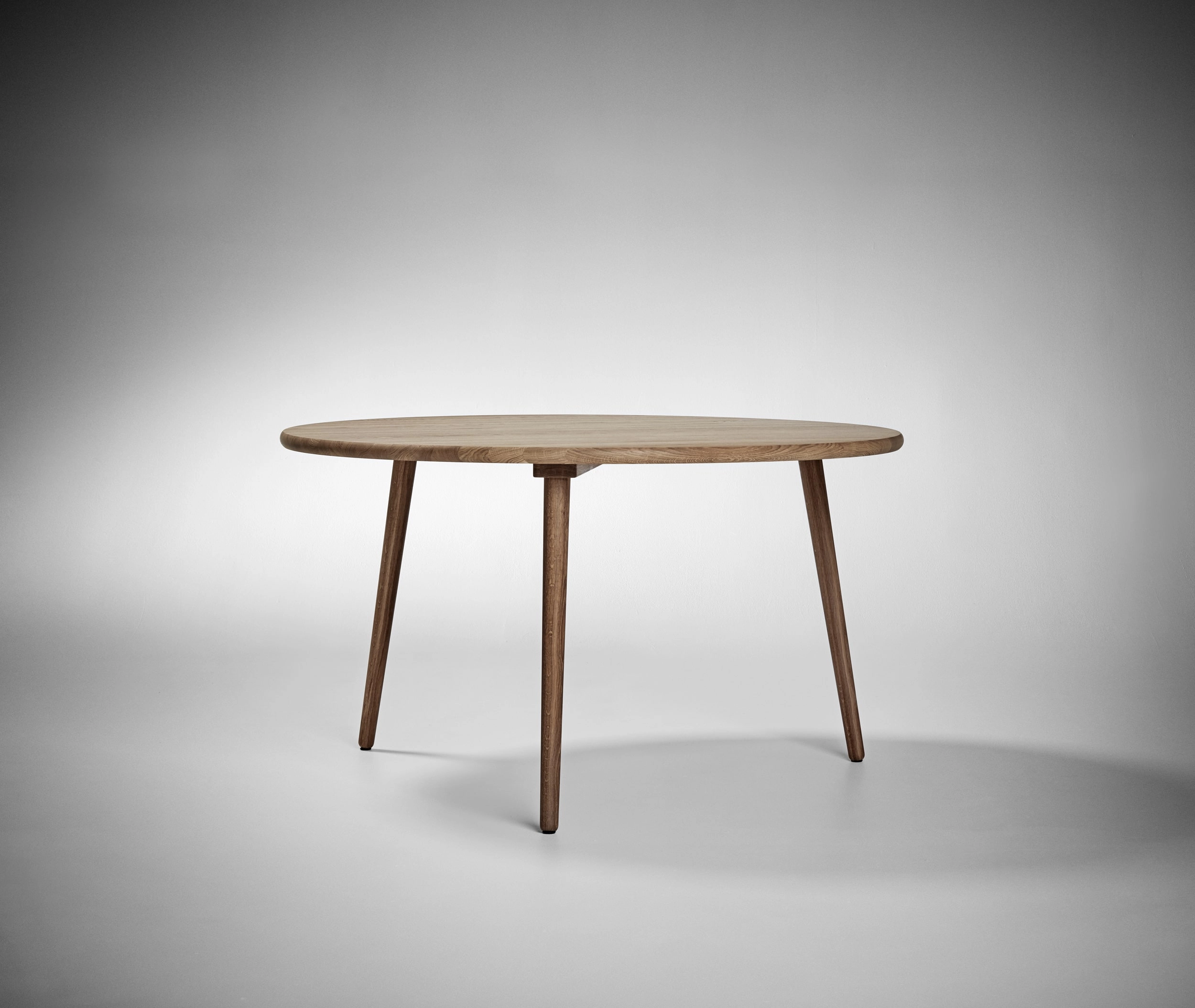 A round table companion for our popular Miss Holly tables, with a robust top and carefully-machined edges and legs that give the table a soft, inviting impression. Simplicity meets a strong material feeling. It can easily seat six people as the table is frameless and has only three legs. The legs are wood threaded and can easily be screwed into the fixed top, no tools needed. The Miss Holly round table is available in solid oak, birch or ash.