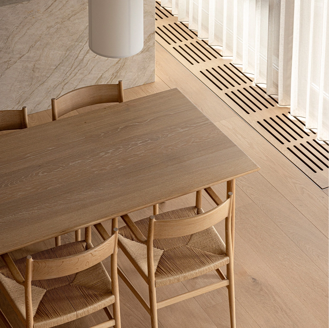 Arv Chair has been selected for the dining room of Holmen Abode, enhancing the space with its tactile quality. This thoughtful choice adds warmth and sophistication, making the dining area a centerpiece of both functionality and aesthetic appeal.
