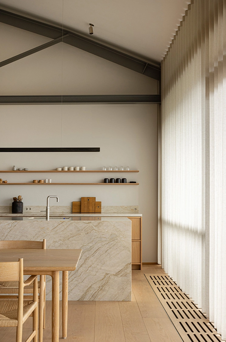 A dreamy fusion of Japanese and Scandinavian design elements invites tranquility and harmony, while the preservation of the inside original steel structure honor the building’s rich heritage, allowing it to form a robust framework for an exquisitely delicate home where heritage and modernity gracefully intertwine.