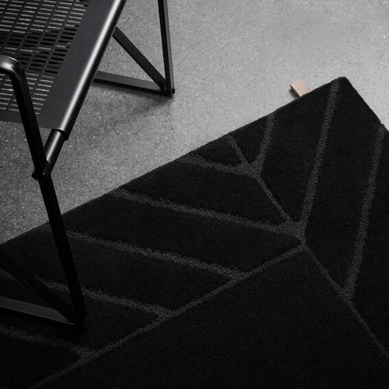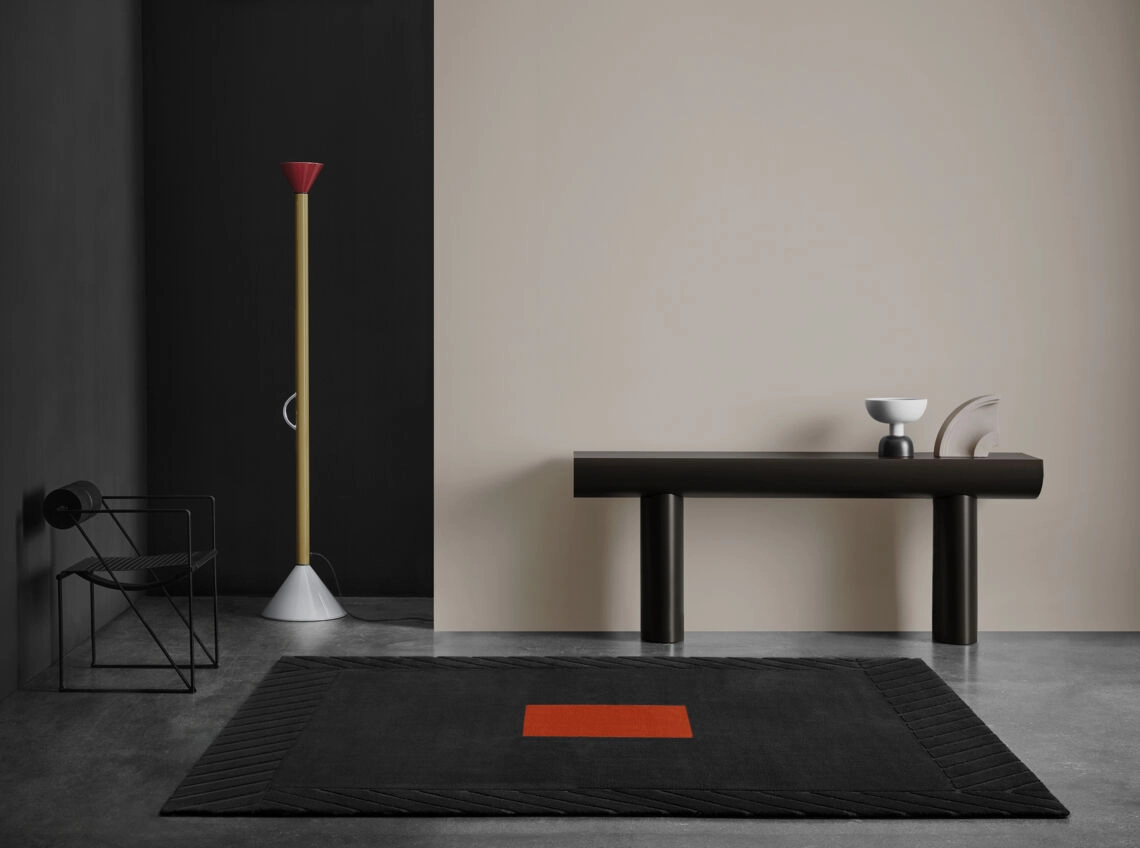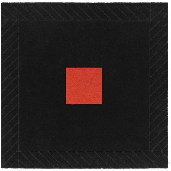 A rug in varying black and coral-colored pure wool. Kasthall Design Studio has reinterpreted it in the same color scheme as it was originally designed in.