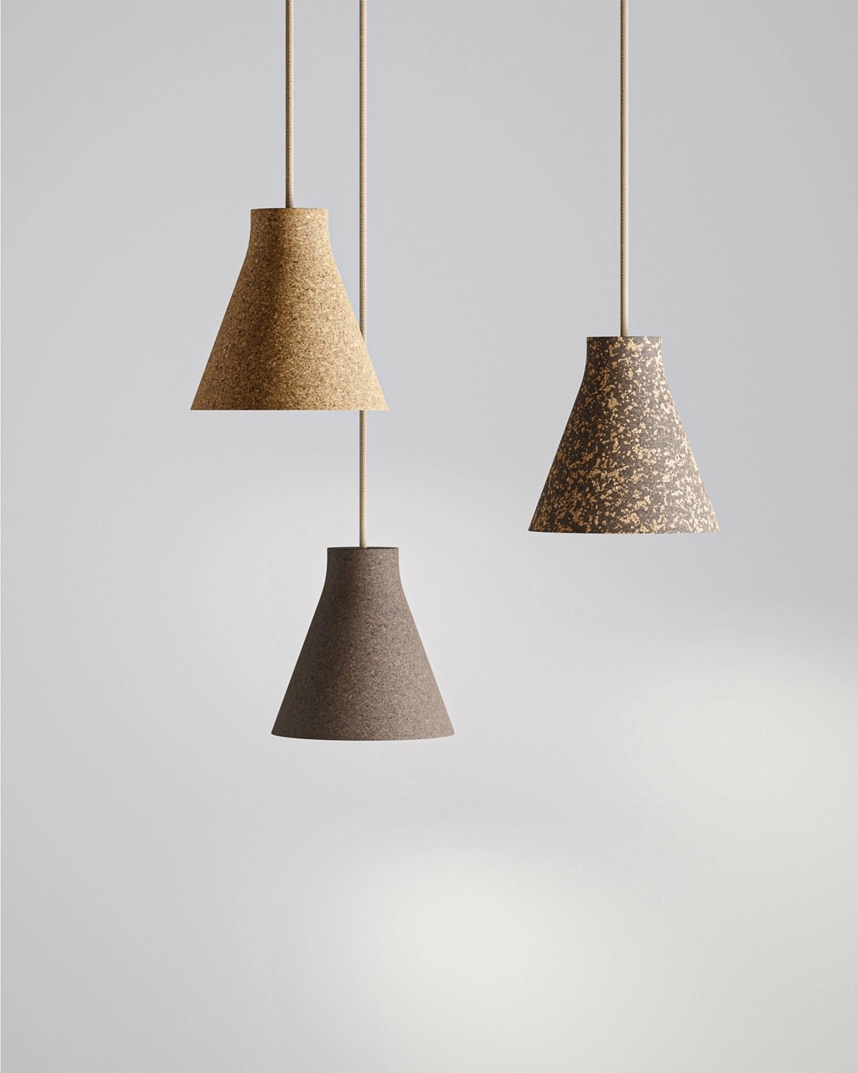 Corka design by Samuel Wilkinson, a new compact pendant made by pressing granulated cork into a two-part mold. Corka’s conical form features a soft internal edge which provides a ring of graduated light from the fitted E27 bulb inside.