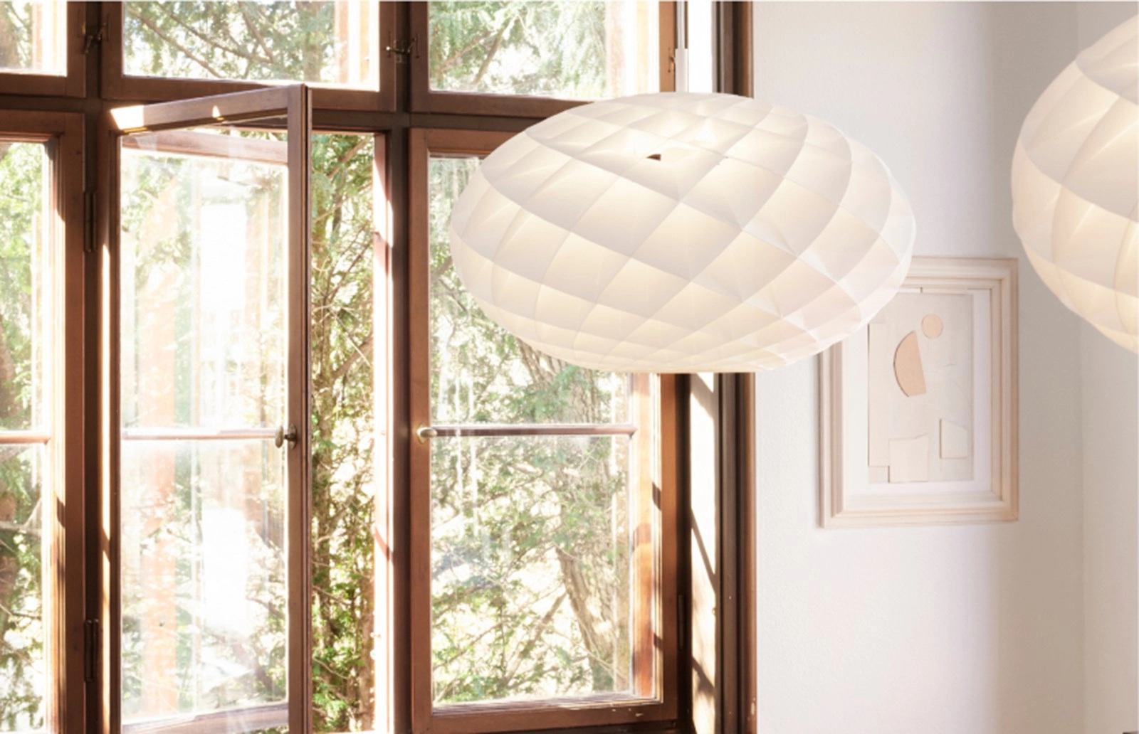 The new Patera Oval is beautiful to behold from all angles, with its Fibonacci sequence-based structure providing a different impression from every vantage point. Its all-round illumination creates a glowing ambience that enhances big contemporary venues, when placed in an elevated position. The pendant can be used with or without a diffuser plate, depending on whether the light source creates unwanted glare or not from above. Patera Oval is an atmospheric pendant with a diameter of 50 centimetres, which will elevate any bedroom, hallway, or corridor, as well as conference rooms, hotel rooms and lobbies. It comes with a white textile cord and an E-socket, making it possible to choose the desired light colour and output. It is also available in an LED version, with the option of 2700 or 3000 Kelvin.