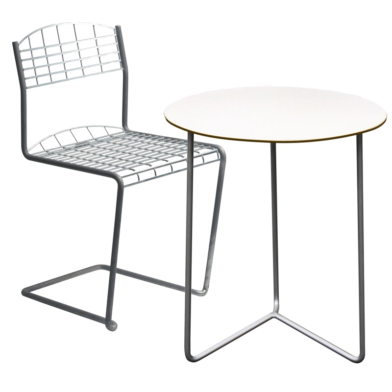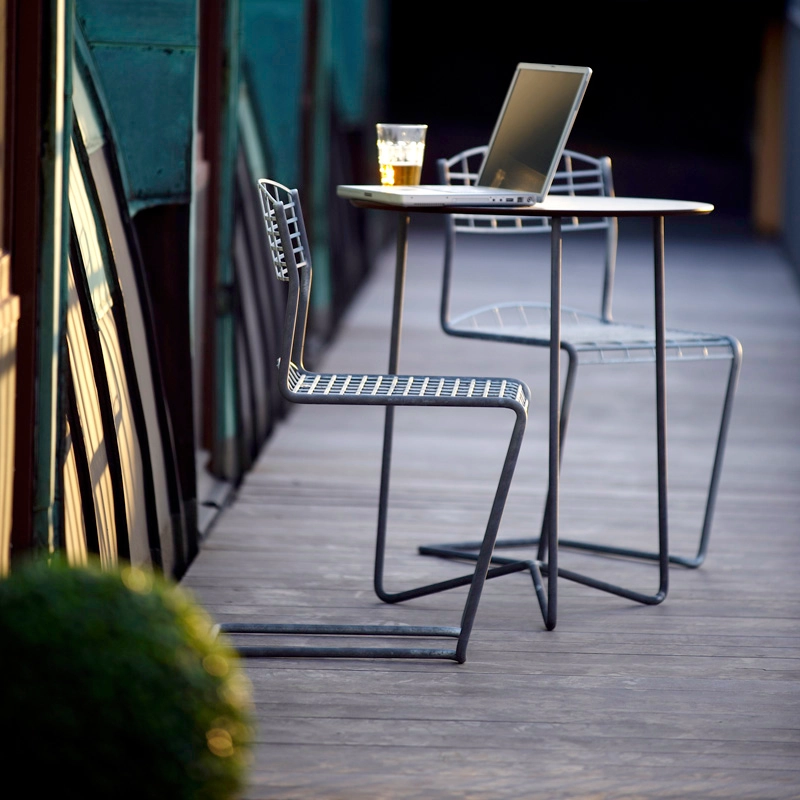 The High Tech table’s design is light and stable. Naturally with Grythyttan Stålmöbler’s high quality in materials down to the smallest detail in manufacturing. The frame is available in three finishes: hot-dip galvanized, dark green and black. The table top is white and made of durable compact laminate. The table top can be provided with custom motifs on order. Total height: 72 cm. Table top dimensions: Ø 60 cm. Both the table and chair are easy to place and suit an outdoor patio as well as indoors. For indoor use, smart floor protectors are available as accessories.