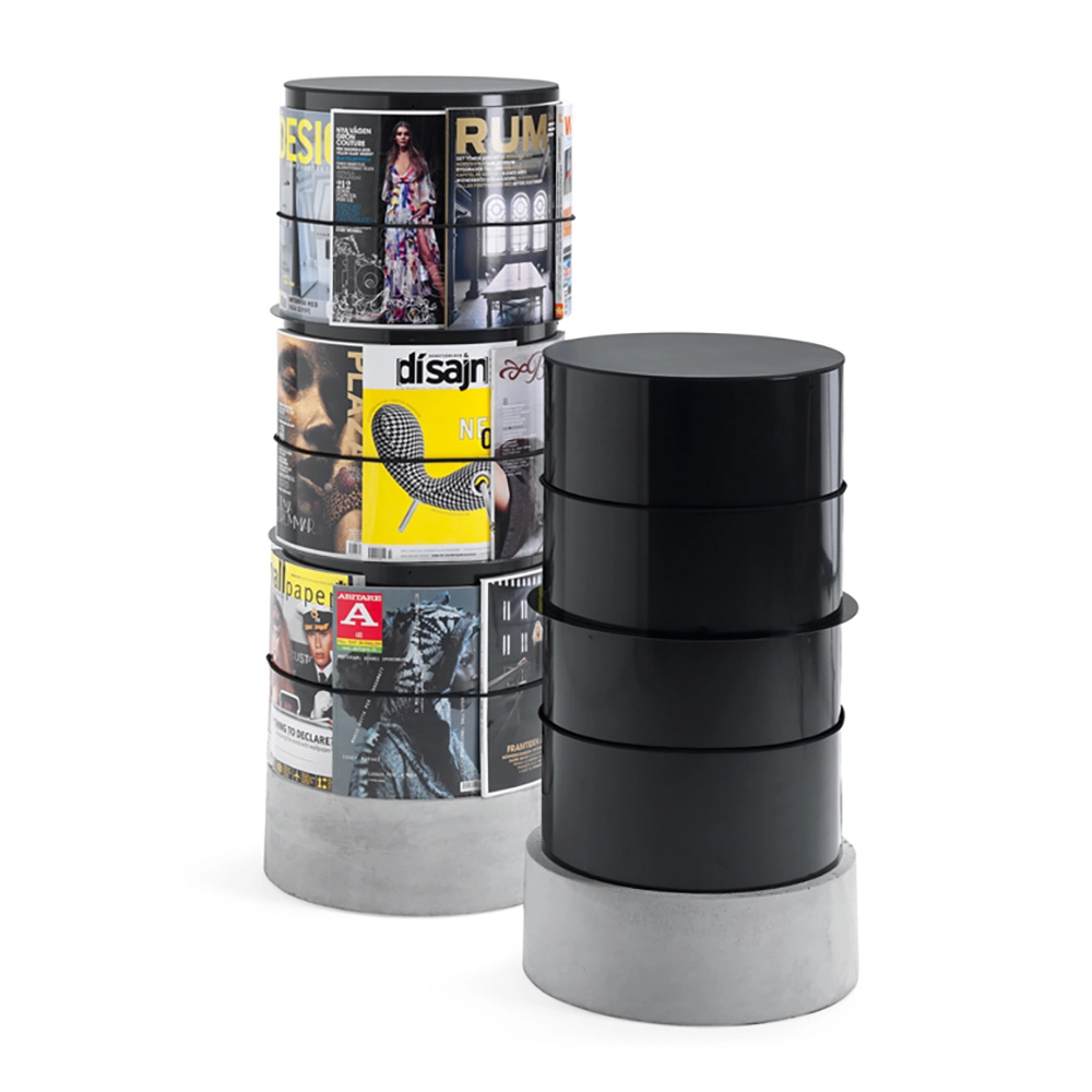 ”An exclamation mark, which can either stand by itself or, if repeated, form beautiful landscapes. Inspired by the pillars of the subway system, which expose layers of posters, it swallows periodicals like no other magazine holder.”