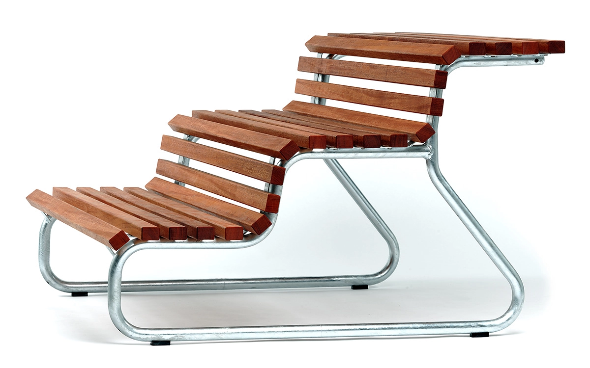 Olympic Olympic is a further development of the Wembley Park bench. With its neat dimensions and sleek tubular frame, it becomes a mini-grandstand that suits both school and park. An economical alternative to the exclusive Wembley Park. The slats in the seat are manufactured in mahogany and together with the hot-dip galvanized frame will age with dignity. Design by Thomas Bernstrand.